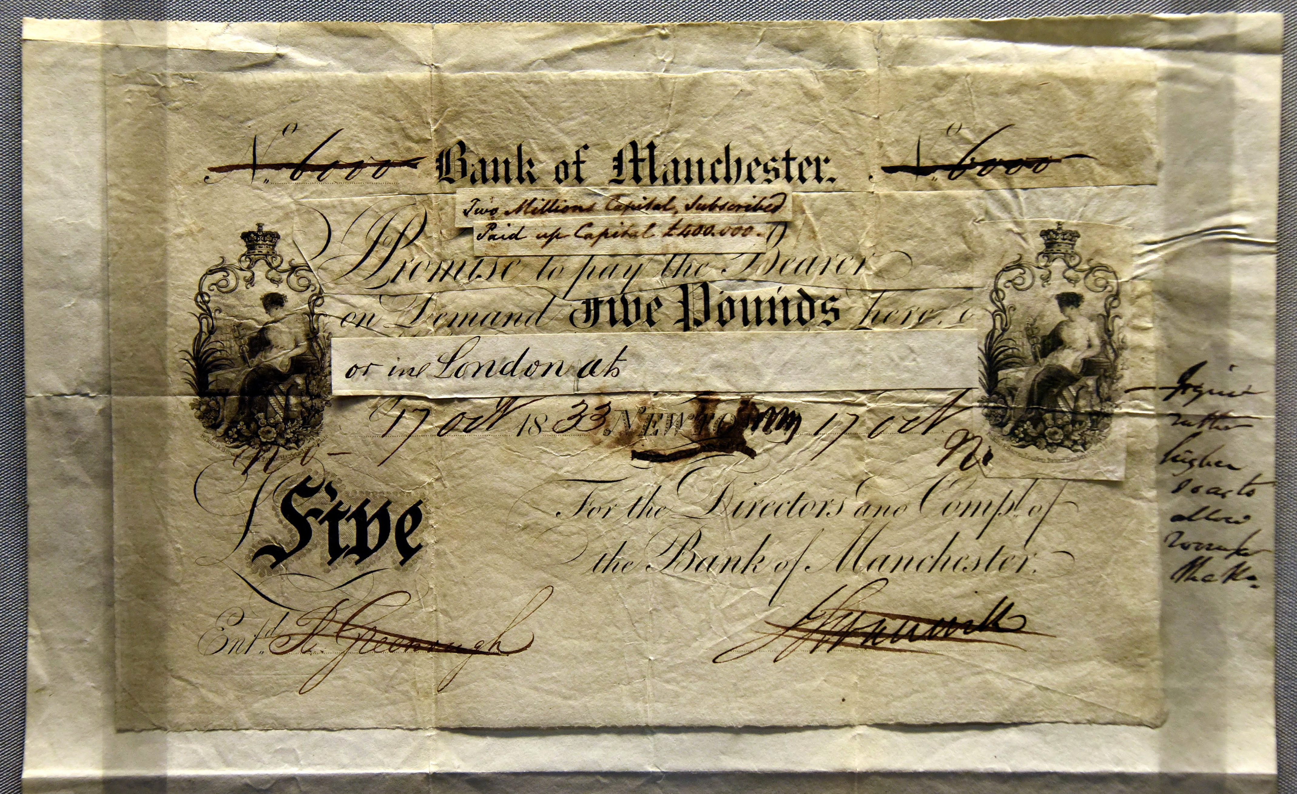 만체스터은행(영국)의 지폐 디자인 콜라주, 1833년. 런던 대영박물관에 전시됨