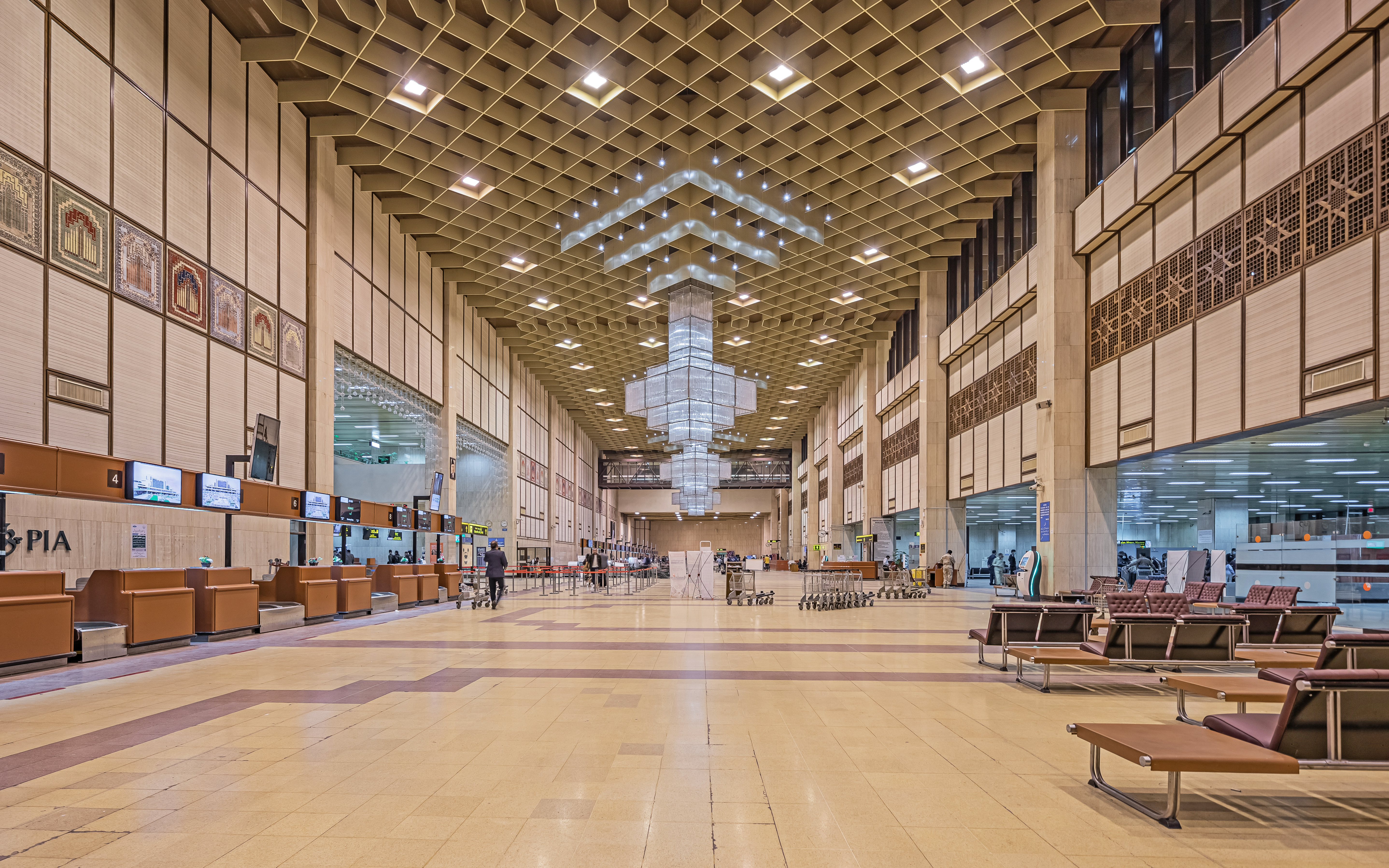 - 파키스탄 국제 항공 : 아부다비, 바레인, 바르셀로나, 베이징/수도, 담맘, 델리, 다카, 도하, 두바이, 제다, 카트만두, 쿠알라룸푸르, 쿠웨이트, 런던(히드로), 맨체스터, 메디나, 뭄바이, 뉴욕(JFK), 파리(샤를 드 골), 리야드, 도쿄(나리타), 토론토(피어슨), 자헤단, 파이살라바드, 과다르, 이슬라마바드, 라호르, 물탄, 스카르두, 수쿠르, 투르바트, 바하왈푸르
