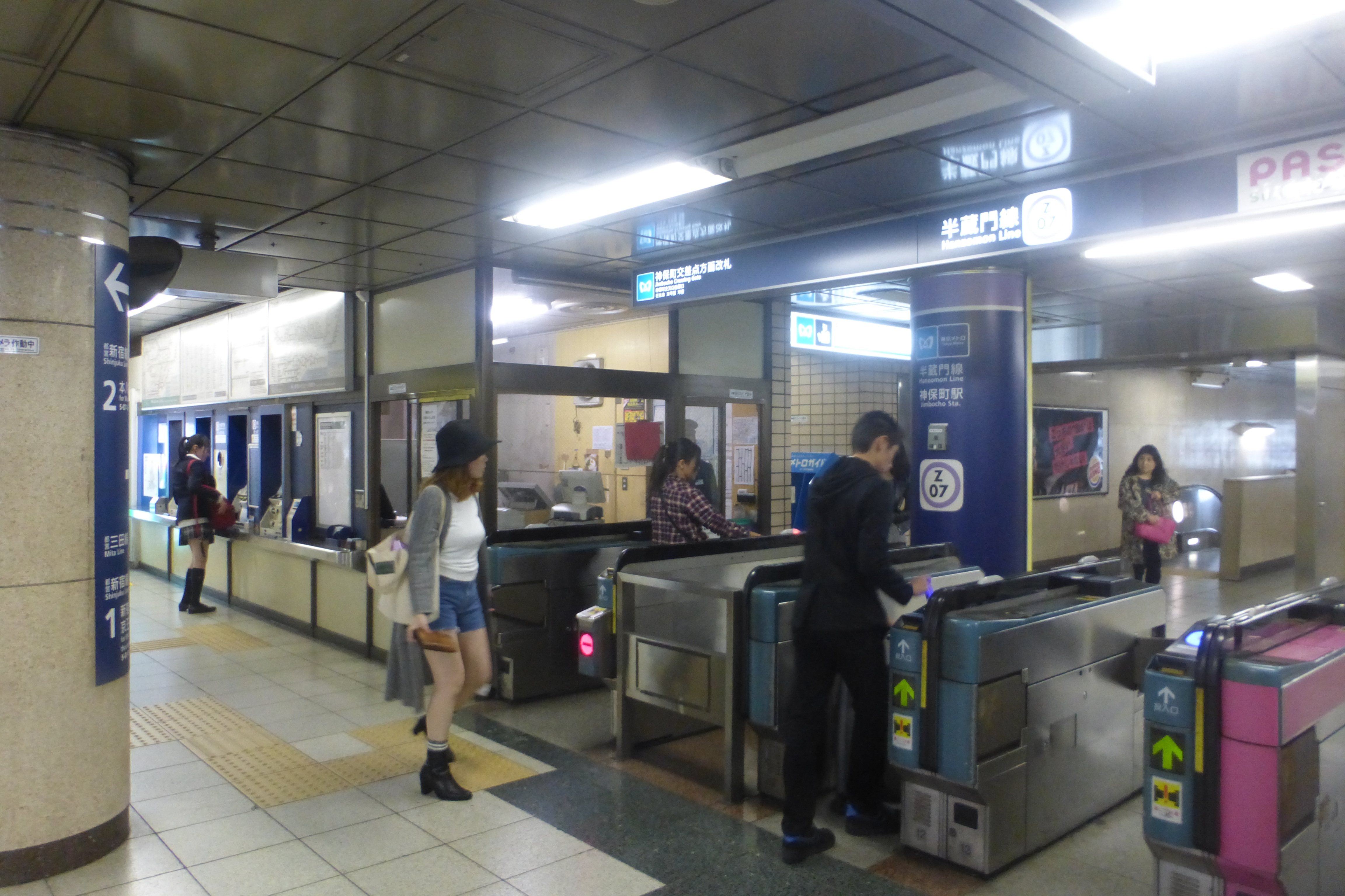 진보초역은 도쿄도 지요다구에 위치한 지하철역으로, 도에이 미타선, 신주쿠선, 도쿄 메트로 한조몬선 3개 노선이 지나간다. 역 구조는 신주쿠선 선로 아래에 한조몬선이 위치하며, 미타선은 별도의 층에 위치하여 환승 시 계단을 이용해야 한다. 이 역은 1972년 미타선 개통을 시작으로 신주쿠선(1980년), 한조몬선(1989년)이 순차적으로 개통되면서 3개 노선이 환승하는 역이 되었다. 진보초역 주변은 대학가로, 특히 고서점과 신간 서점이 많아 "일본의 카르티에 라탱"으로 불리기도 한다. 2022년 기준 미타선은 1일 평균 117,659명, 신주쿠선은 106,478명이 이용했다.