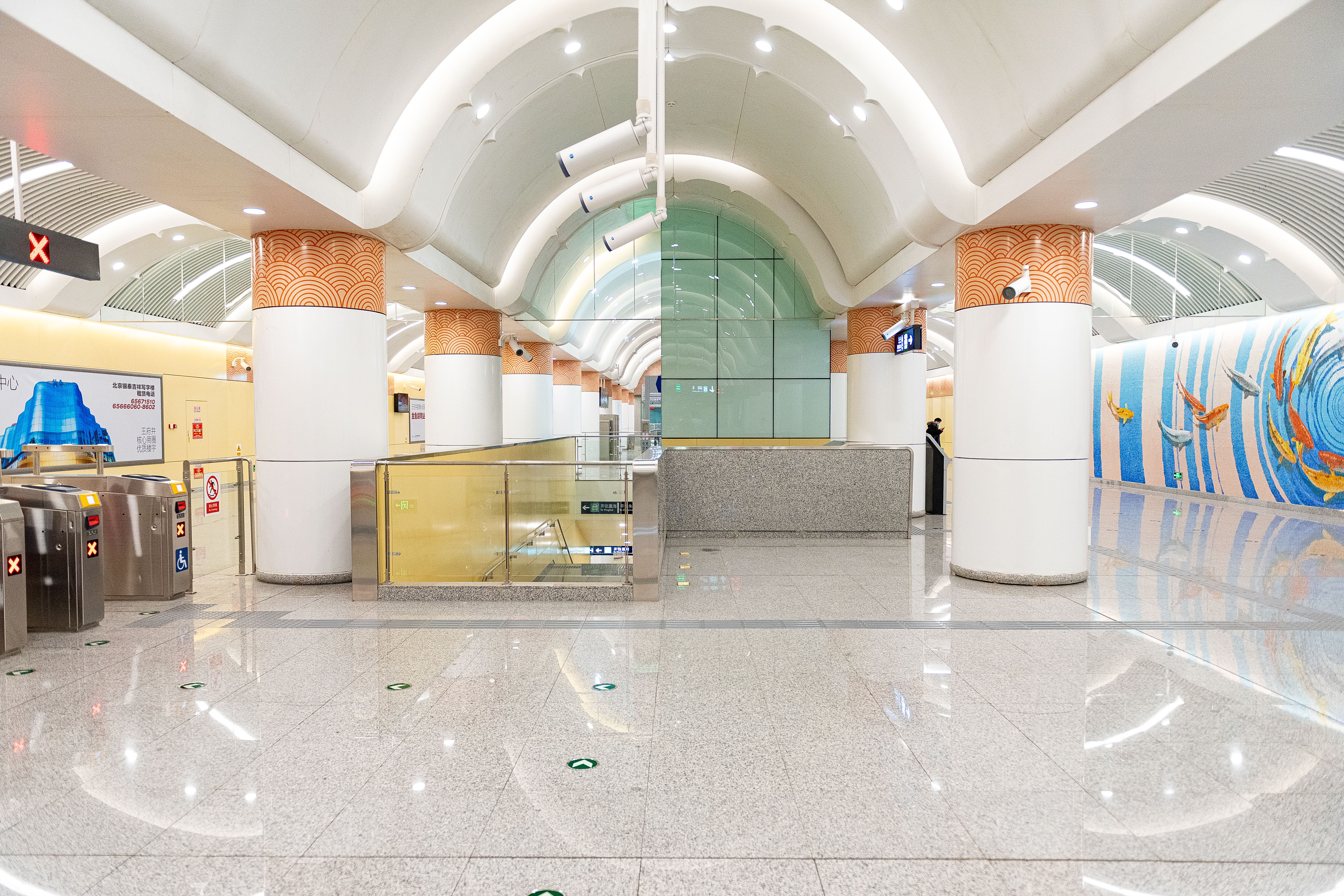 역 내부 기둥 상단에는 물고기 비늘무늬 장식이 있다.[5] 대합실 한쪽 벽면에는 길이 15m, 높이 4.5m 크기의 예술벽 '连年有鱼|연년유어중국어'가 설치되어 있다. 이 예술벽에는 뛰어오르는 금붕어 문양이 새겨져 있는데, 이는 "상서롭고 뜻대로 되며, 해마다 넉넉하기를 빈다(吉祥如意,年年有余|길상여의, 연년유여중국어)"는 의미를 담고 있다.[11][12]