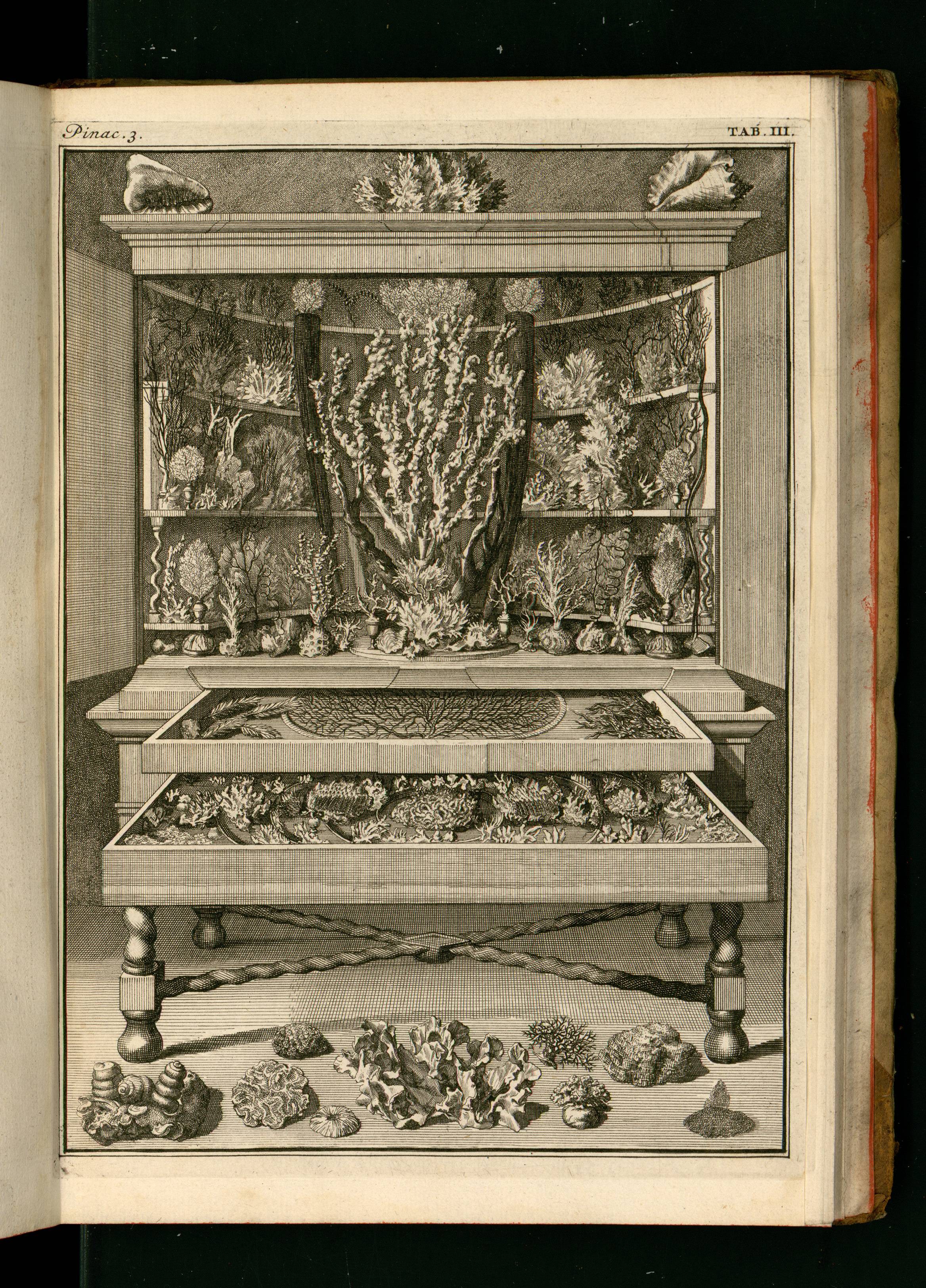 페란테 임페라토의 ''델리스토리아 나투랄레''(나폴리, 1599년)에 실린 판화는 자연사 수집품을 보여주는 초기 그림 기록이다. 이 판화에서 방 오른쪽에는 중세 시대 방식대로 눕혀 쌓거나 등 부분이 위로 향한 채 있는 책들이 꽂힌 책장이 보인다. 이 책들 중 일부는 표본집을 나타내는 것으로 추정된다. 아치형 천장은 보존된 물고기, 박제된 포유류, 조개 등으로 채워져 있고, 중앙에는 박제된 악어가 매달려 있다. 책장에는 산호 표본도 놓여 있다. 방 왼쪽은 스터디올로처럼 꾸며져 있는데, 복잡하게 맞춰진 벌집 모양 틈새와 광물 표본으로 채워진 내장형 캐비닛이 있다.[4] 그 위에는 대리석과 재스퍼가 박힌 패널 또는 박제된 새들이 놓인 벌집 모양 칸막이가 있다. 아래에는 표본 상자와 덮인 단지가 있는 찬장이 있다.