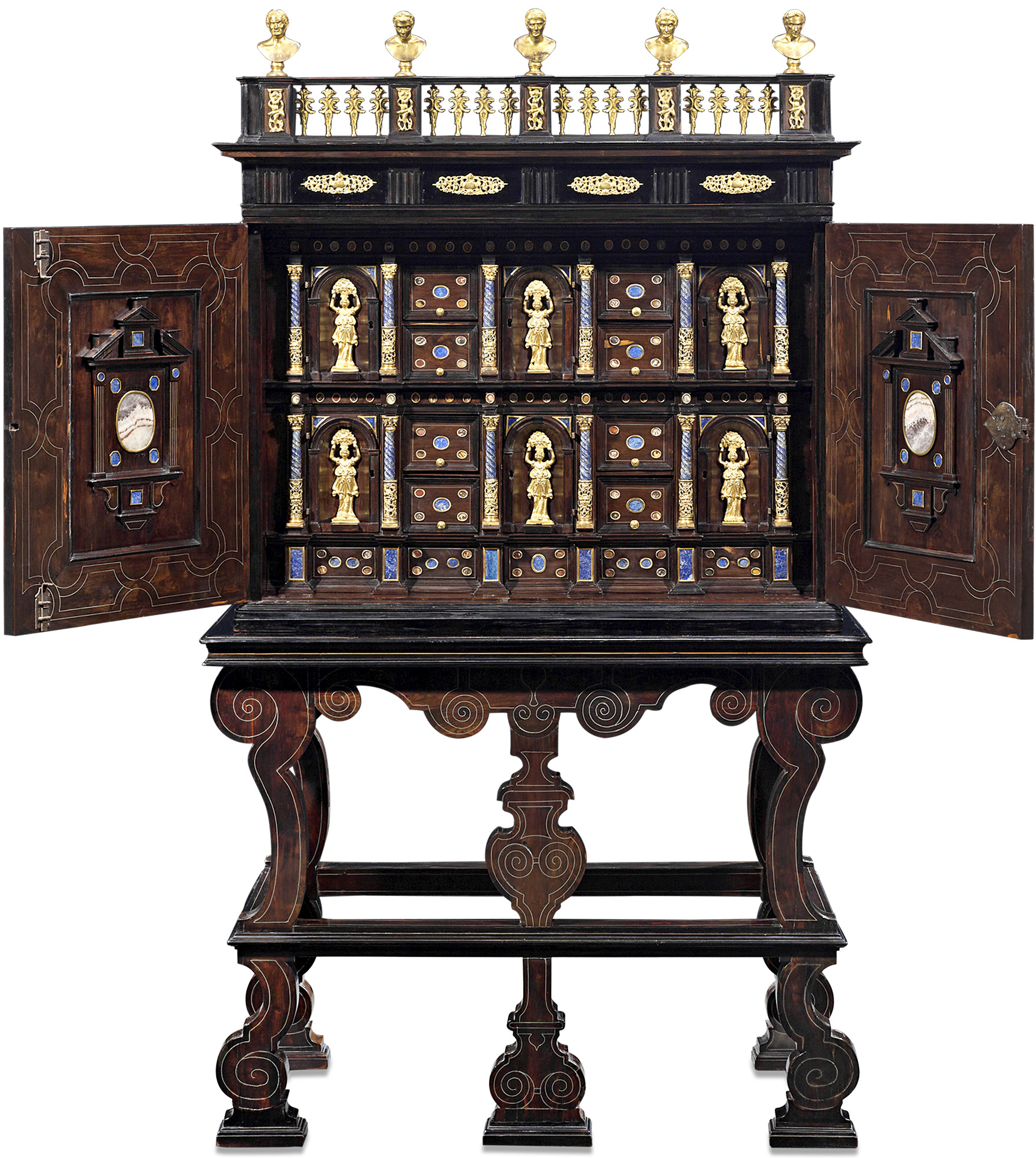 Sixteenth-century cabinet-makers serving the luxury trades of [[Florence]] and [[Antwerp]] were beginning to produce moveable cabinets with similar architectural interior fittings, which could be set upon a carpet-covered table or on a purpose-built stand.