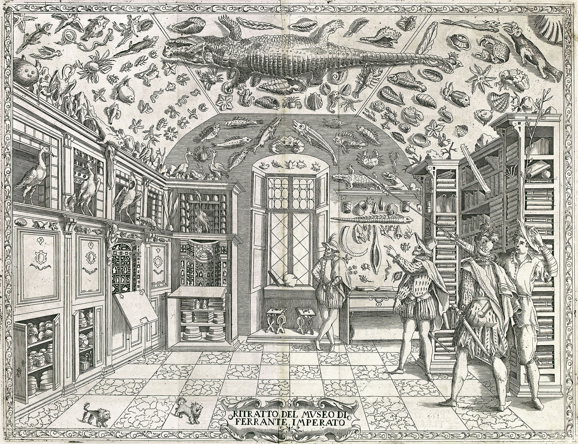 페란테 임페라토의 ''델리스토리아 나투랄레''(나폴리 1599)에 실린 판화는 자연사 수집품을 보여주는 초기 그림 기록이다. 이 책의 저자는 자신의 신뢰성을 입증하기 위해 책장을 보여주는데, 중세 시대 방식대로 책들이 눕혀져 쌓여 있거나 등 부분이 위로 향해 있다. 책들 중 일부는 표본집을 나타낸다. 천장은 보존된 물고기, 박제된 포유류, 조개 등으로 채워져 있고, 중앙에는 박제된 악어가 매달려 있다. 산호는 책장에 놓여 있다.[4] 왼쪽에는 ''스터디올로''처럼 꾸며진 방이 있는데, 광물 표본으로 채워진 캐비닛이 있다.[4] 그 위에는 광택 석재 표본, 박제된 새들이 놓여 있다. 그 아래에는 표본 상자와 단지가 있는 찬장이 있다.