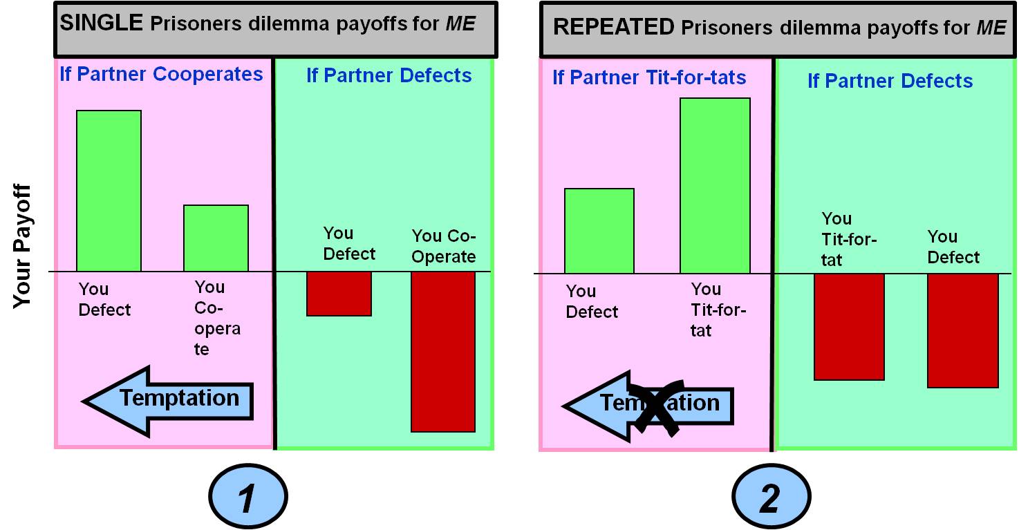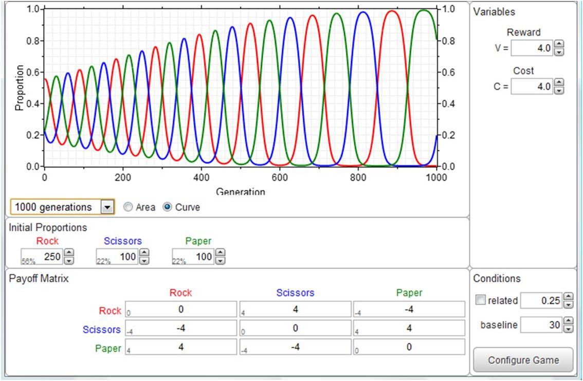 2) 게임은 게임 규칙에 따라 개체의 전략을 테스트한다. 이러한 규칙은 적합도 단위(자손 생산률)로 서로 다른 보상을 생성한다. 경쟁 개체는 일반적으로 개체군이 고도로 혼합된 상태에서 다른 개체와 짝을 이룬 경쟁을 한다. 개체군 내 전략의 혼합은 개인이 다양한 전략과 경쟁에서 만날 수 있는 확률을 변경하여 보상 결과에 영향을 미친다. 개체는 "보상 행렬"로 표현되는 경쟁 결과에 의해 결정된 결과 적합도를 가지고 짝을 이룬 게임 경쟁을 종료한다.