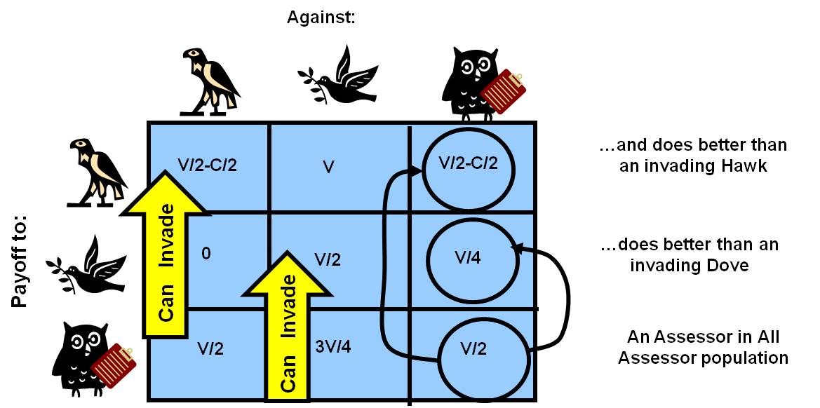 자원의 가치를 V, 싸움으로 인해 발생하는 부상(손실)의 비용을 C라고 가정할 때, 각 전략의 보상은 다음과 같이 결정된다.[1]