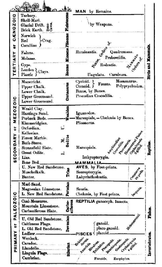 19세기 초, 화석 기록에 대한 지식이 발전하면서, 1840년대에는 지질 시대의 윤곽이 명확해졌고, 1841년 존 필립스는 고생대, 중생대, 신생대를 명명했다. 애덤 세지윅과 윌리엄 버클랜드는 이러한 발전을 멸종의 반복적인 대격변적 사건과 새로운 창조로 보았다.[65] 버클랜드 등은 성경의 홍수와 연결하려 했다.[66][67]