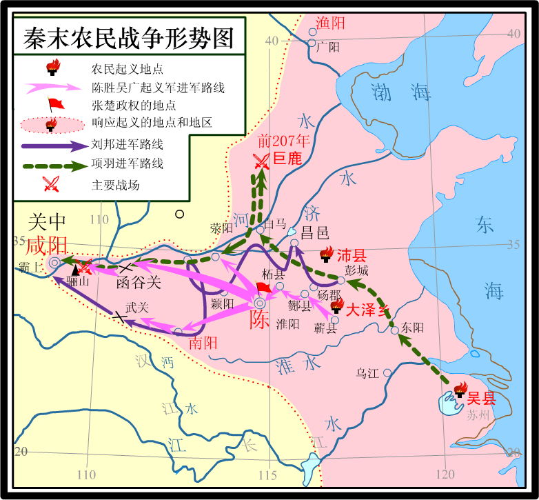 장한이 군사적 능력을 발휘하여 반란군을 격파하기도 했지만, 항우와의 결전에서 패배하고 포로가 되었다. 그 후, 투항한 20만 명의 진나라 병사들은 항우에 의해 생매장되었다. 조고는 유방이 함양 가까이 접근해오자 이세 황제를 암살하고, 자영을 왕으로 세웠으나, 자영에게 주살되었다.