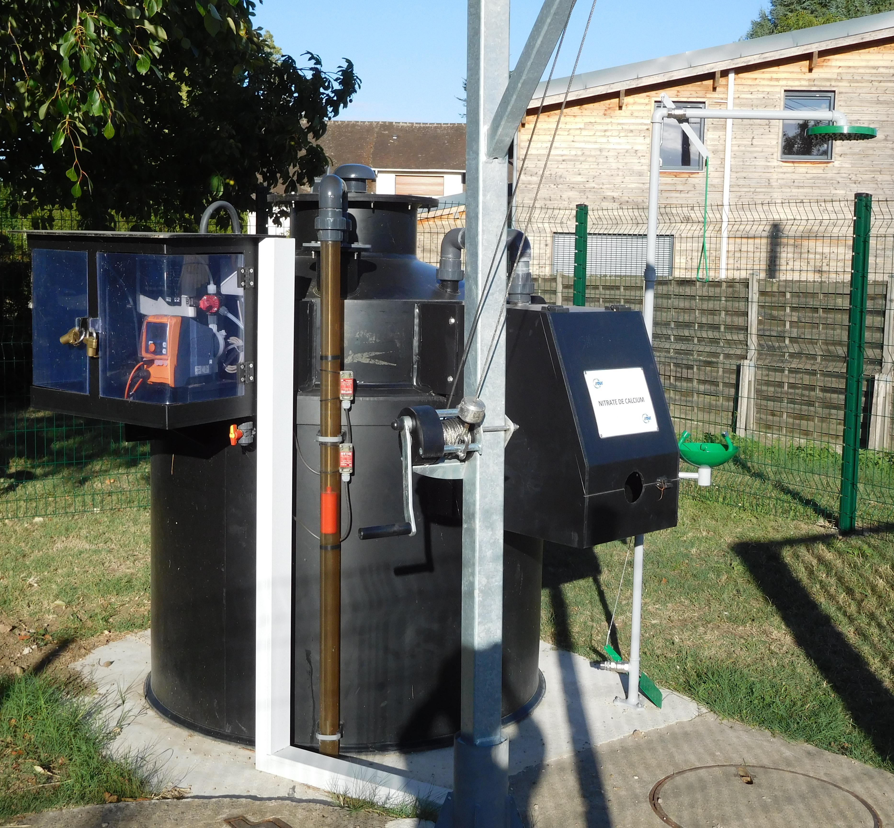 질산 칼슘은 악취 발생을 막기 위한 폐수 전처리 과정에 사용된다. 폐수 전처리는 폐수 시스템 내에 산소가 없는 생물학적 환경을 조성하는 것을 기반으로 한다. 질산염이 존재하면 황산염에 대한 신진대사가 중단되어 황화수소 형성을 방지한다.[5] 또한, 쉽게 분해되는 유기물이 소비되어 그렇지 않으면 하류에서 혐기성 조건을 유발하고 악취를 발생시킬 수 있다. 이 개념은 잉여 슬러지 처리에도 적용할 수 있다.[6]
