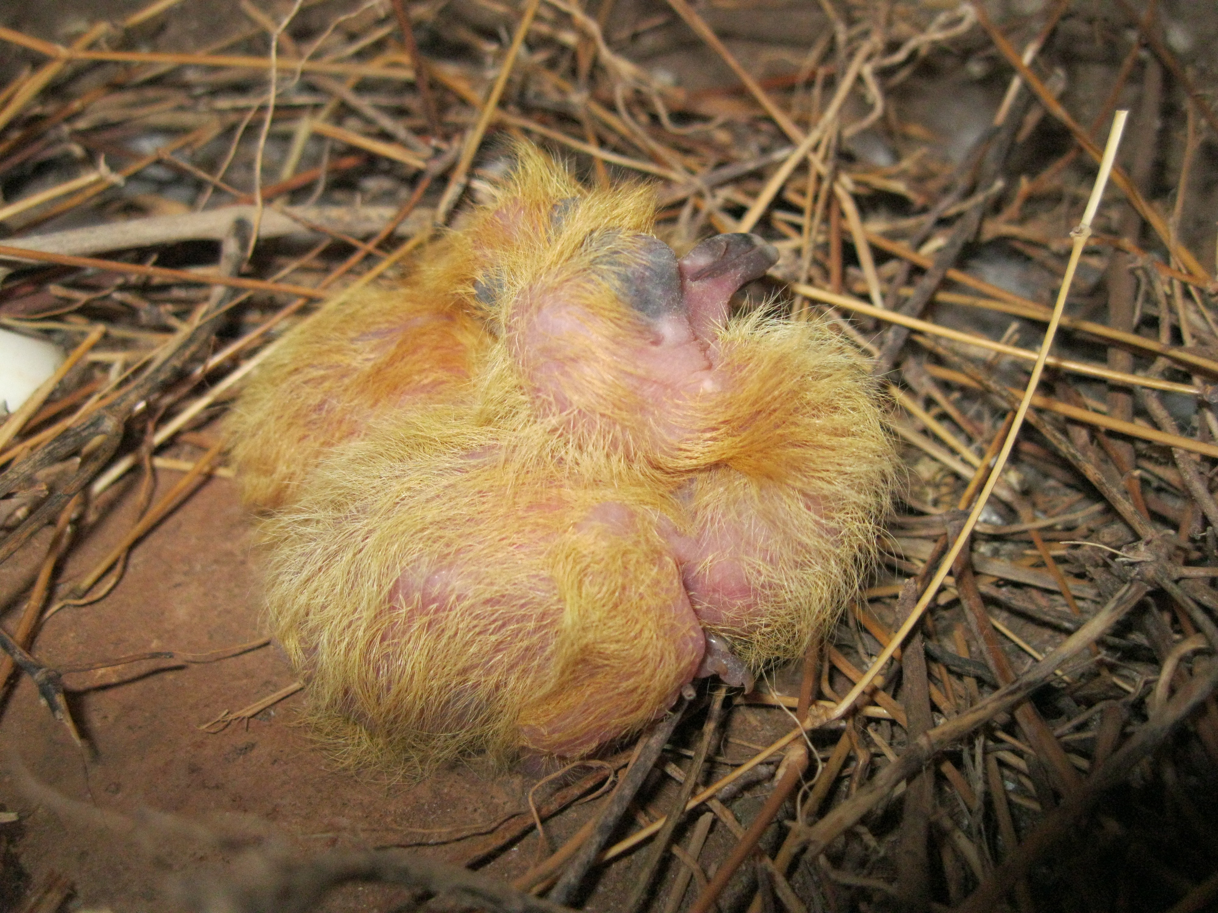 비둘기 새끼는 ''스쿼브(squabs)'', ''스퀴커(squeakers)'', 또는 ''핍(peeps)''이라고 불리는데, 후자 두 가지는 먹이를 구걸할 때 내는 울음소리에서 유래한 명칭이다.[32] 처음에는 부모가 젖샘젖(혹은 인간이 기르는 경우, 적절한 대체품])으로 새끼에게 먹이를 준다. 어떤 품종들은 너무 허약하게 사육되어 새끼를 성공적으로 기르기 위해 인간의 개입이 필요할 수 있으며, 이는 특수 스쿼브 사료를 먹이거나 다른 비둘기 쌍에게