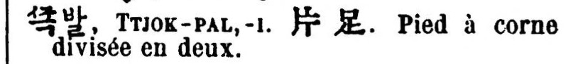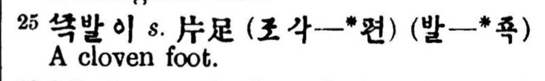 1880년 파리 외방전교회가 요코하마에서 출판한 프랑스어-한국어 사전에는 "ᄶᅩᆨ발. Pied à corne divisée en deux."라고, 캐나다인 선교사 James Scarth Gale|제임스 스카스 게일영어의 한국어-영어 사전(1897년)에는 "ᄶᅩᆨ발이 A cloven foot."라고 기록되어 있어, 한일 병합 조약 이전부터 이 단어가 쓰였음을 알 수 있다.