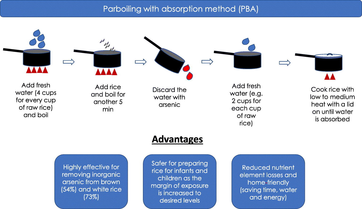2020년 연구에서는 비소 함량을 줄이고 영양소를 보존하는 쌀 조리 절차로 찐쌀과 물 흡수를 포함하는 절차를 권장했다.[17][18]