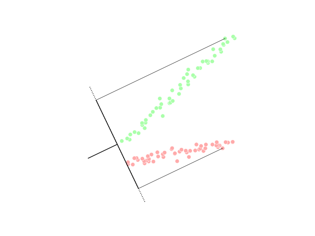 2차원 점 집합에 대한 결과적인 LDA 투영의 시각적 묘사. - 일반화된 판별 분석 (GDA): 커널 함수 연산자를 사용하여 비선형 판별 분석을 수행한다.