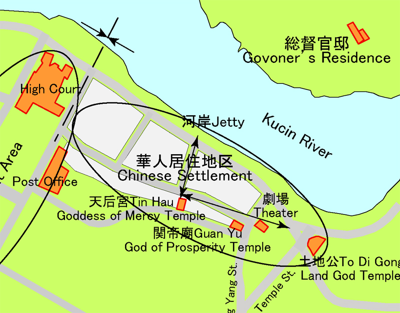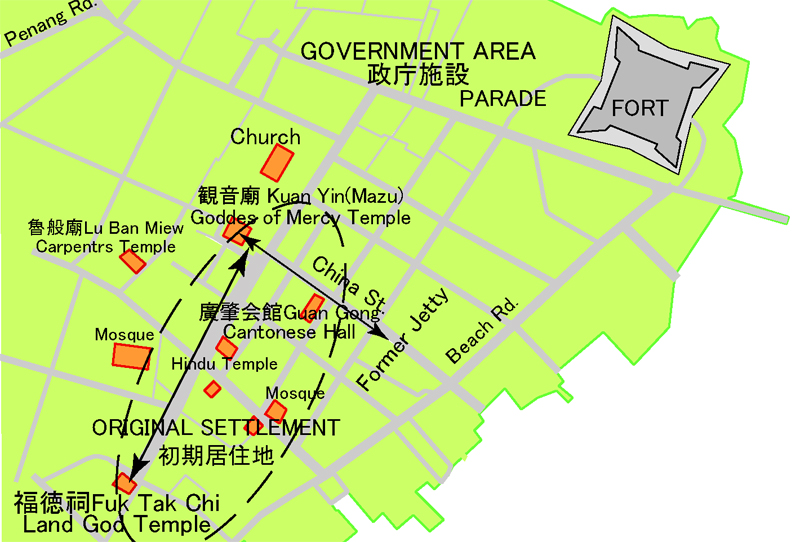 안전한 항해를 기원하는 마조와 새로운 정착지의 안녕을 기원하는 토지공을 모시는 것이 필수적이었으며, 상업이 발전하면서 관제묘가 추가되었다. 19세기 서양 열강의 식민지나 조계가 동아시아에 들어서면서, 차이나타운은 서양인 거주자에게 도시 서비스를 제공하는 역할을 하며 관제묘의 중요성이 커졌다.