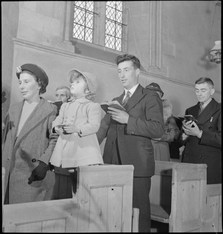 기독교에서 교회 신도들은 예배의 일부로 함께 찬송가를 부르는 경우가 많다.(사진: 1944년 영국 어핑턴 교구 교회에서 예배를 드리는 사람들)