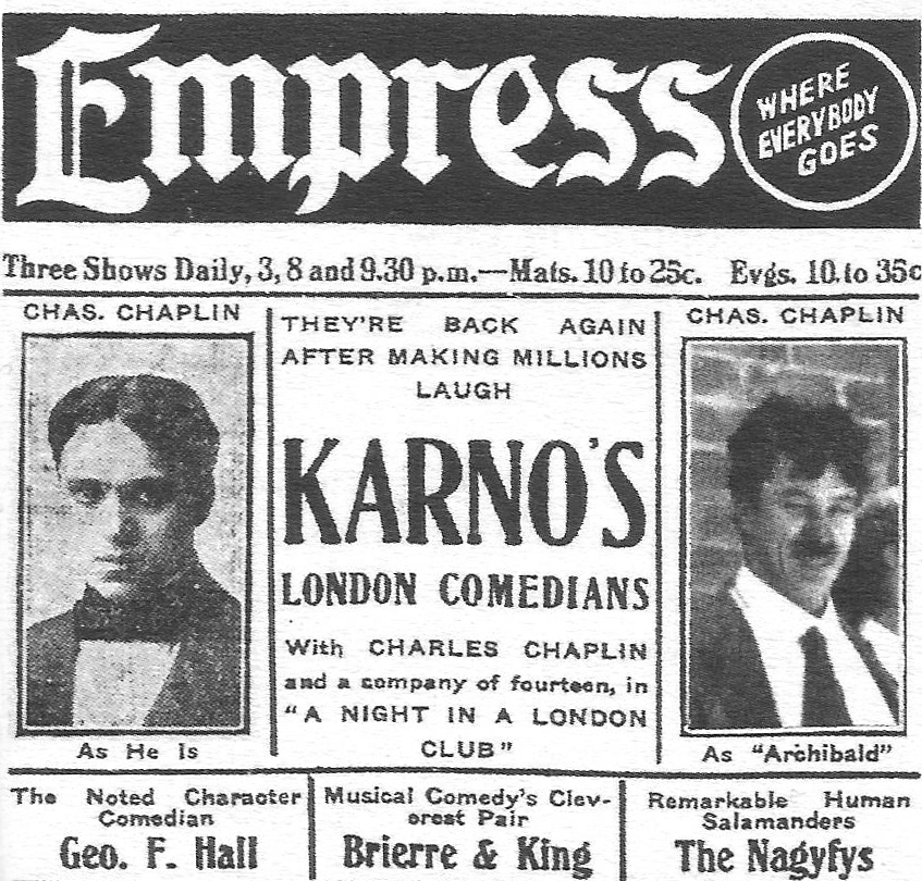 같은 해, 채플린은 카르노 극단의 미국 순회 공연에 참가했고, 비평가들로부터 "지금까지 본 최고의 팬터마임 배우 중 한 명"이라고 평가받았다. 미국 순회 공연은 21개월이나 이어졌고, 1912년 6월에 영국으로 귀국했지만, 10월에는 다시 미국 순회 공연에 참가했다.