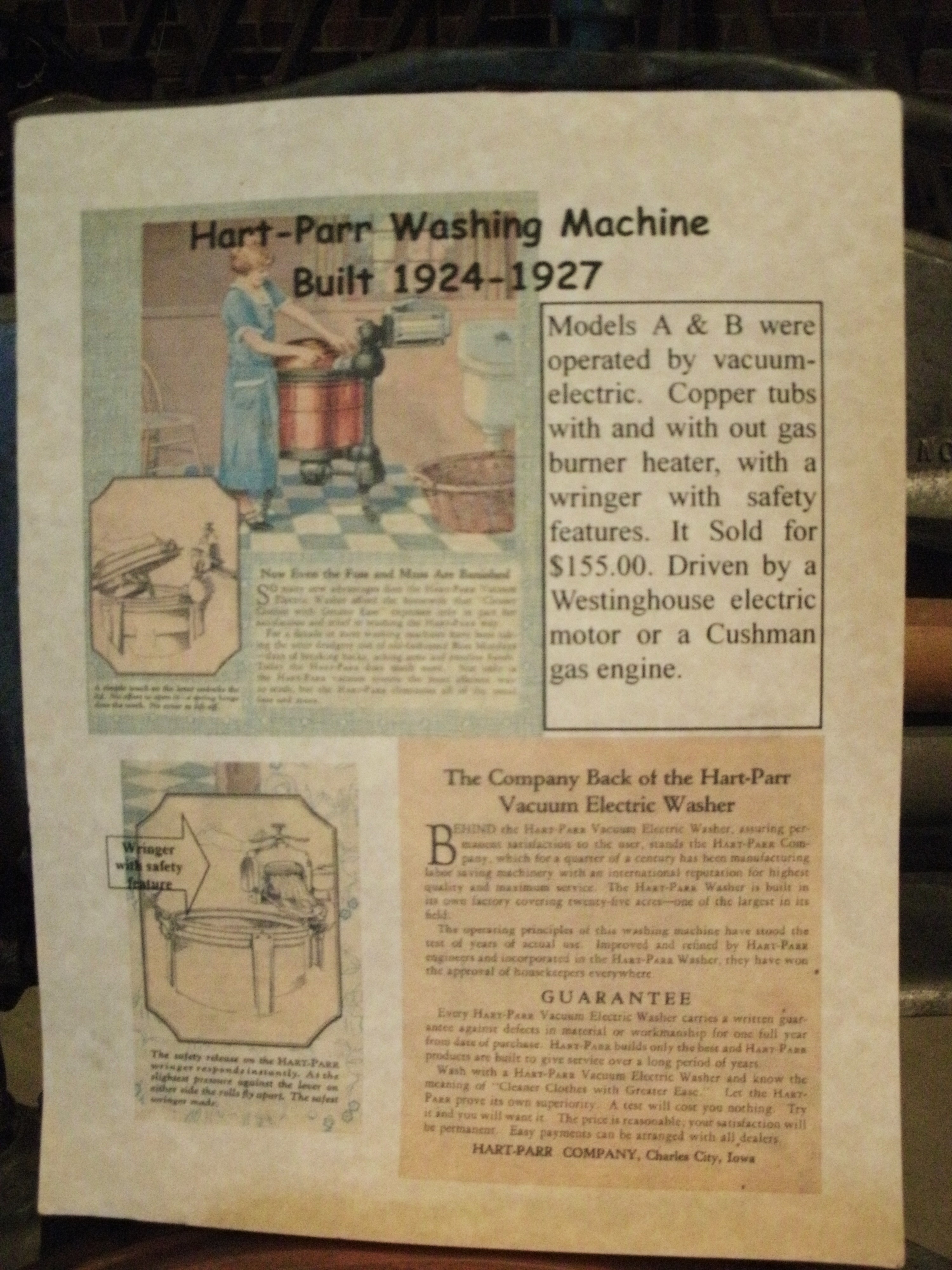 트랙터 생산으로 가장 잘 알려져 있지만, 하트-파르 회사는 최초의 세탁기 중 일부도 생산했다. 1920년대에 155달러에 판매되었으며, 구매자는 전기 엔진 또는 가솔린 엔진을 선택할 수 있었다.