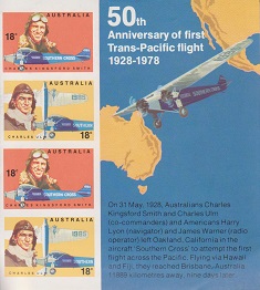1928년 킹스퍼드 스미스와 찰스 울름은 미국에서 포커 F.VII/3m 단엽기를 구입하여 ''서던크로스''(Southern Cross)라고 이름 붙였다.[21]1928년 5월 31일 오전 8시 54분,[21] 킹스퍼드 스미스는 오스트레일리아로 향하는 최초의 태평양 횡단 비행을 위해 4명의 승무원과 함께 캘리포니아주 오클랜드를 출발했다. 비행은 세 단계로 이루어졌다.[22]