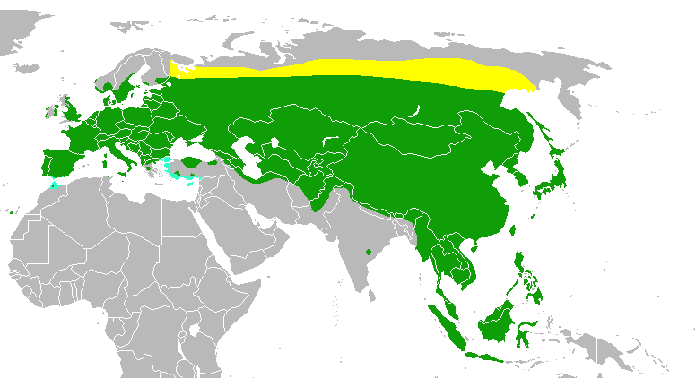 참새는 서쪽의 포르투갈부터 동쪽의 일본까지 유라시아 대륙의 넓은 범위에 걸쳐 분포한다.[85] 자연 번식 범위는 대략 온대 유럽과 아시아 대부분을 포함하며, 북쪽으로는 북위 68°N 이남(7월 평균 기온이 12°C 이상인 지역)까지, 남쪽으로는 동남아시아를 지나 자바와 발리까지 이른다.[5] 인도 등 남아시아에서는 주로 온대 지역에서 발견된다.[17][18] 대부분 지역에서는 텃새로 정착하여 살아가지만, 가장 북쪽에 번식하는 개체군은 겨울을 나기 위해 남쪽으로 이동하며,[19] 일부는 남부 유럽에서 북아프리카와 중동으로 이동하기도 한다.[5]