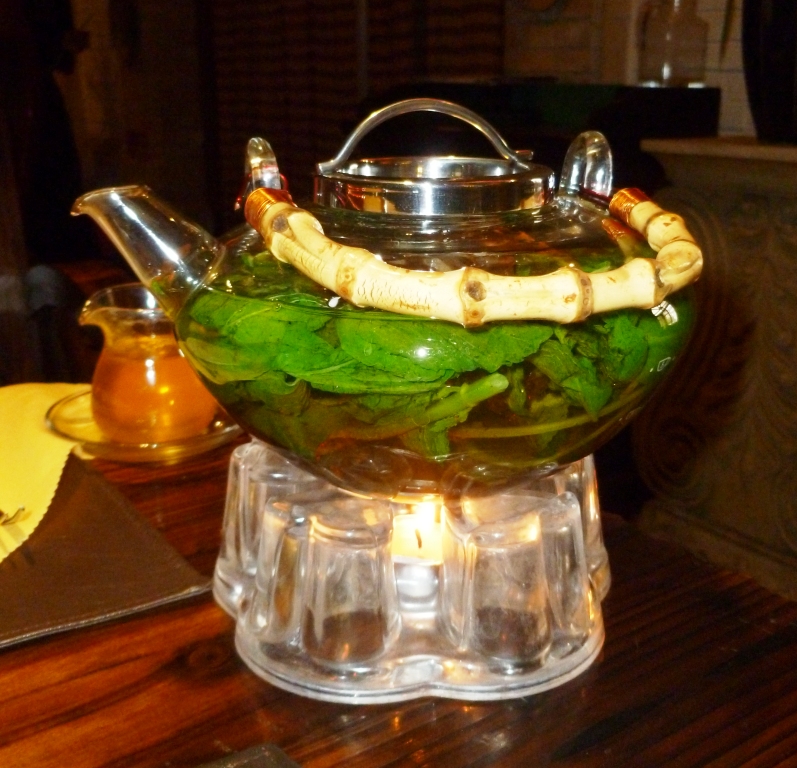 카슈가르, 신장에서 티라이트로 데워지는 민트 잎이 들어있는 유리 찻주전자