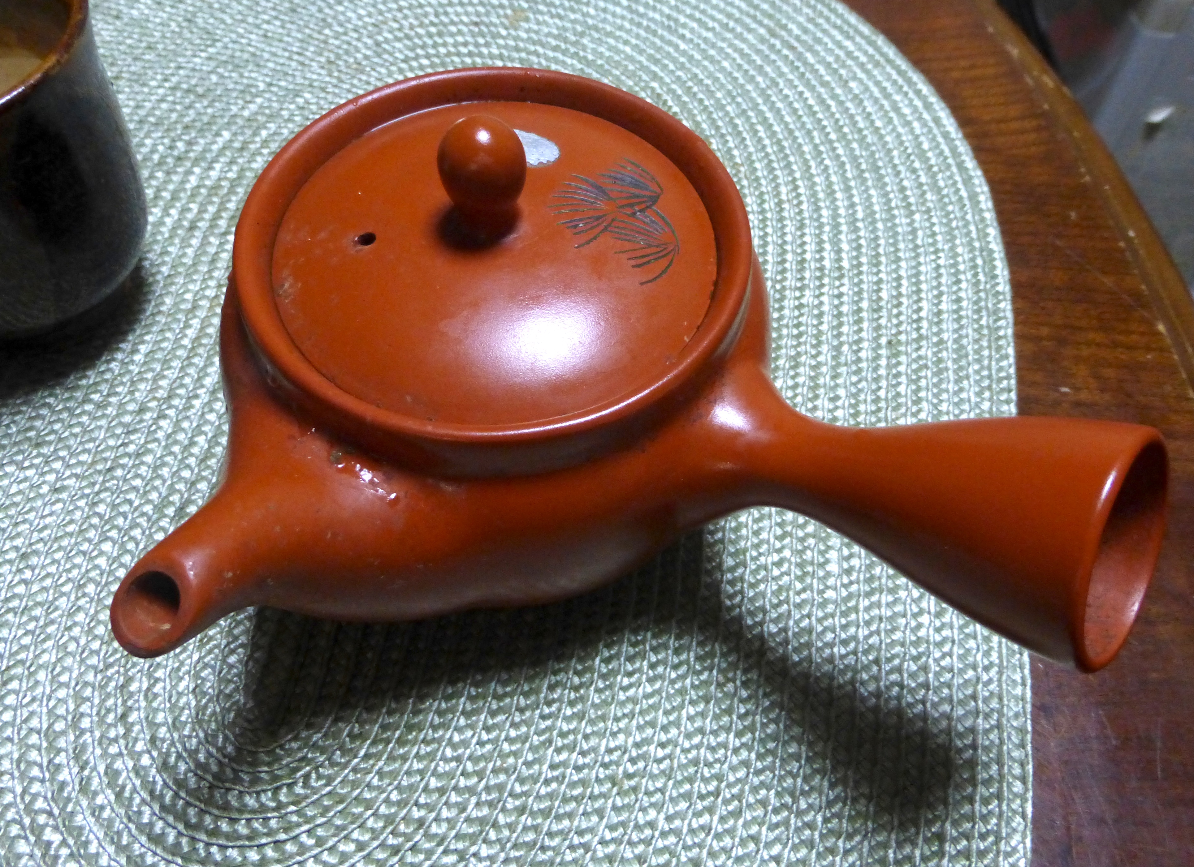 전통적인 일본 찻주전자, 교스(急須)는 일본 녹차, 센차를 만들 때 흔히 사용된다. 찻주전자 옆면에 손잡이가 달려 있다.