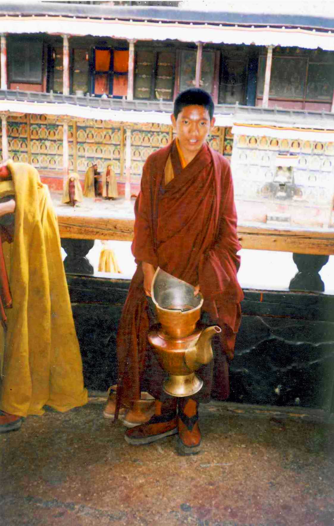타쉴룬포의 수도승이 큰 찻주전자를 들고 있는 모습