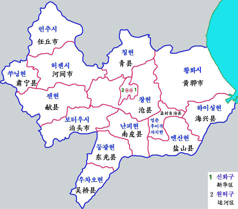 멍춘 후이족 자치현 | 孟村回族自治县 | Mèngcūn Huízú Zìzhìxiàn | 203,507 | 393km2 | 458 |