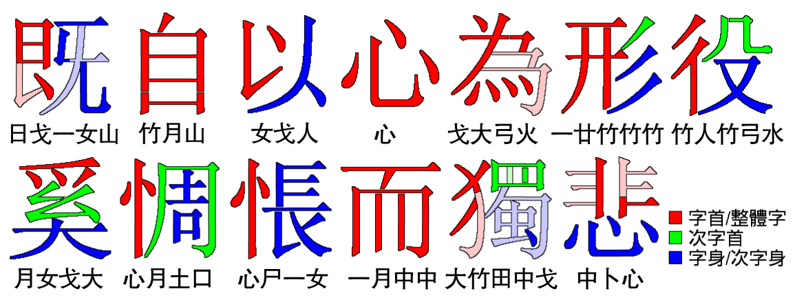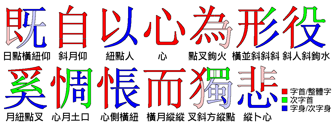 하지만 한자를 분해하는 방식이 때로는 서예의 전통적인 필순이나 구조와 다르게 오직 시각적 형태에만 기반하는 경우가 있고("車"를 "十田十"으로 분해하는 등), 일부 글자("龍"을 "卜月卜尸心"으로 분해)는 분해 규칙이 독특하여 익숙해지기까지 다소 어려움이 있을 수 있다.