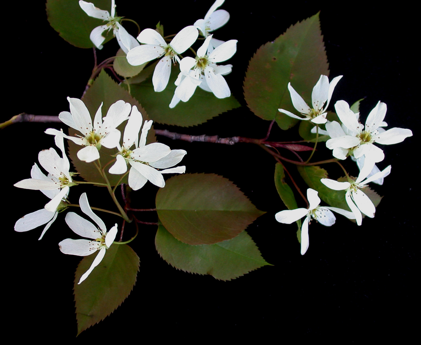 Amelanchier canadensis캐나다 서비스베리, 셰이드블로우 서비스베리,[9] 빌베리,[10] 동부 셰드부시, 인디언 배뉴펀들랜드에서 온타리오주 남부까지의 캐나다, 메인에서 앨라배마까지의 미국