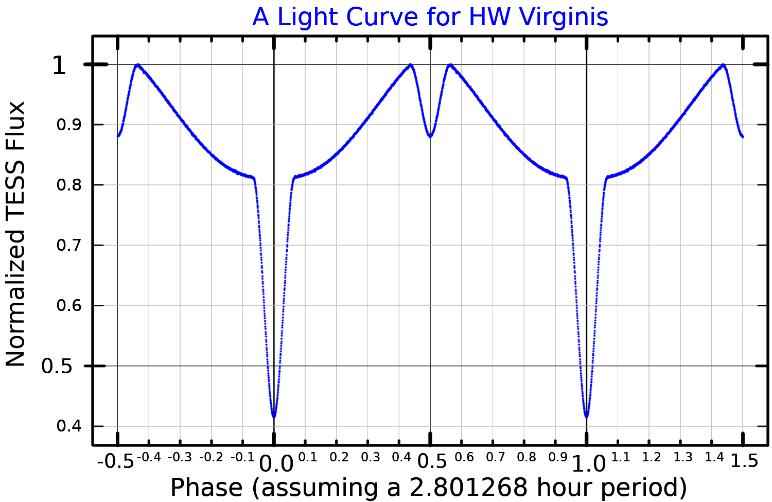 처녀자리 HW를 이루는 주성과 반성은 우리 눈으로 볼 때 시선 방향에 대해 일직선으로 놓여 있기 때문에 일정 주기마다 한 쪽 별이 다른 쪽 별을 가리면서 밝기가 어두워졌다가 밝아지는 것처럼 보인다. 따라서 식쌍성으로도 분류할 수 있다. 구성원은 분광형 B형의 준왜성과 적색 왜성으로 준왜성의 표면 온도는 3만 도, 적색 왜성은 3천 도로 차이가 크다. 따라서 준왜성이 적색 왜성을 가릴 때는 밝기 변화가 크지 않지만, 반대로 적색 왜성이 준왜성의 빛을 가릴 경우 전체 밝기는 급격히 떨어진다. 지구에서 보았을 때 적색 왜성이 준왜성을 가리기 시작한 뒤 다시 원래 밝기로 돌아오는 데에는 약 20분이 걸린다. 처녀자리 HW 주위를 도는 암석 행성의 궤도 경사각이 두 항성의 공전 궤도와 일치할 경우, 행성 표면에 서 있는 관측자는 하늘이 3시간이 조금 못 되는 주기마다 20분 동안 어두워졌다가 밝아지는 현상을 볼 수 있을 것이다.[13]