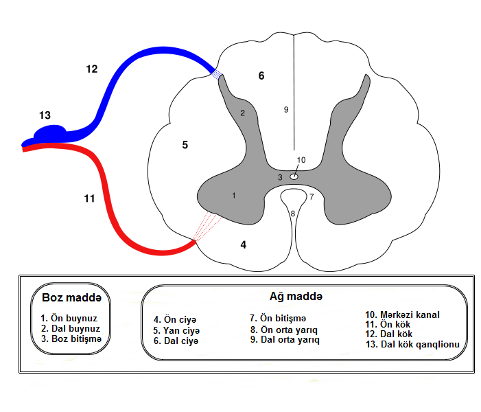 등쪽 뿌리는 구심성 신경 섬유 신경 다발로, 피부, 근육 및 내장 기관에서 뇌로 전달될 감각 정보를 수신한다. 뿌리는 해당 뉴런의 세포체로 구성된 척수후근 신경절에서 끝난다. 배쪽 뿌리는 척수의 배쪽(또는 앞쪽) 회색 뿔에서 세포체가 발견되는 운동 뉴런에서 발생하는 원심성 신경 섬유로 구성된다.[5]