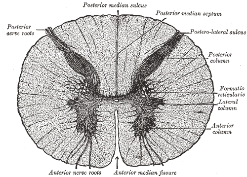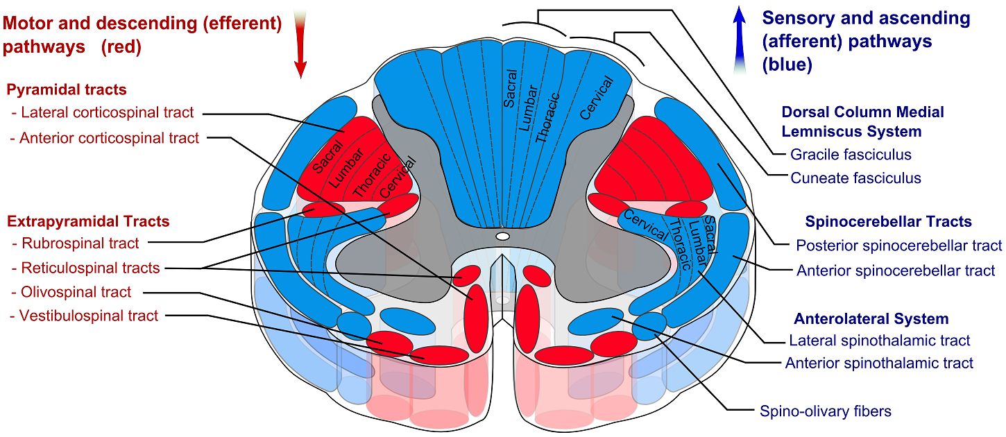 척수는 뇌와 말초신경 사이에서 다리 역할을 하는 신경계로, 운동 및 감각 신경이 모두 모여 있다. 뇌에서 내려오는 운동신경은 사지 근육의 운동 기능을 담당하고, 말단 감각 수용기에서 올라가는 감각신경은 몸 전체(얼굴 제외)의 감각을 담당한다. 또한, 방광 및 항문 조임근 조절 등 일부 자율신경 기능도 담당한다.[30]