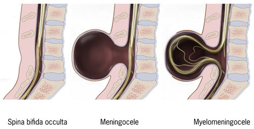 • 척수수막류 (Myelomeningocele): 수막과 신경 조직이 함께 돌출되어 심각한 합병증을 유발하는 형태이다. 칼슘 통로 차단제, 카르바마제핀, 사이토칼라신, 고체온증, 발프로산 등의 독소 및 조건과 관련이 있다.[14]