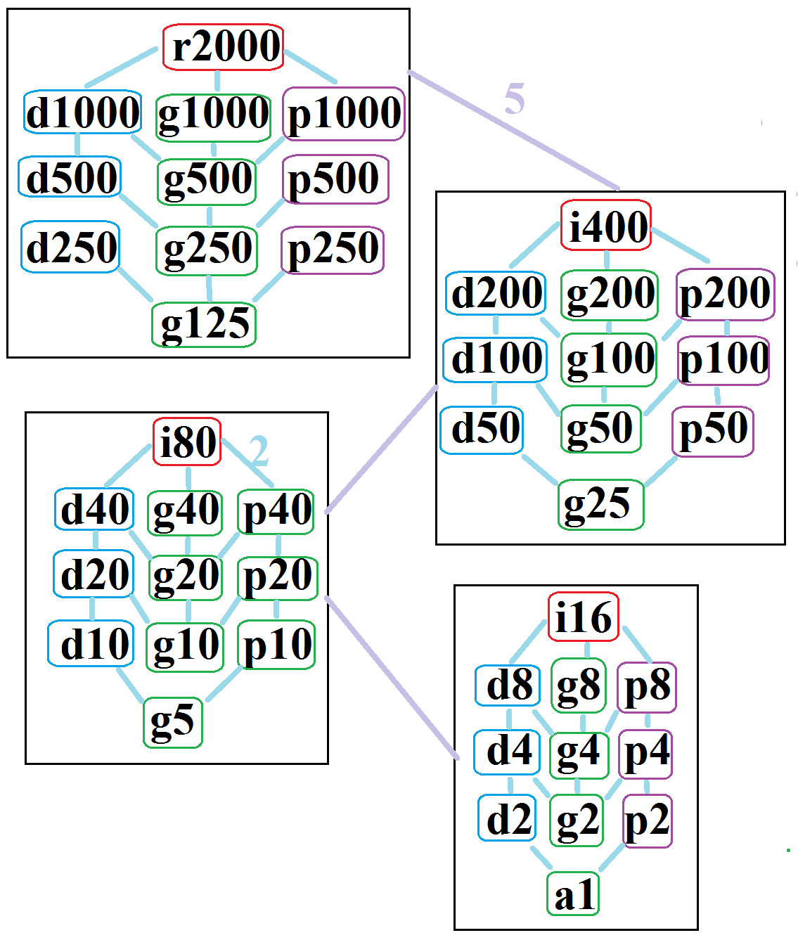 정규 천각형의 대칭성. 밝은 파란색 선은 지수 2의 부분군을 나타냅니다. 4개의 상자 안의 부분 그래프는 지수 5 부분군에 의해 위치적으로 관련되어 있습니다.