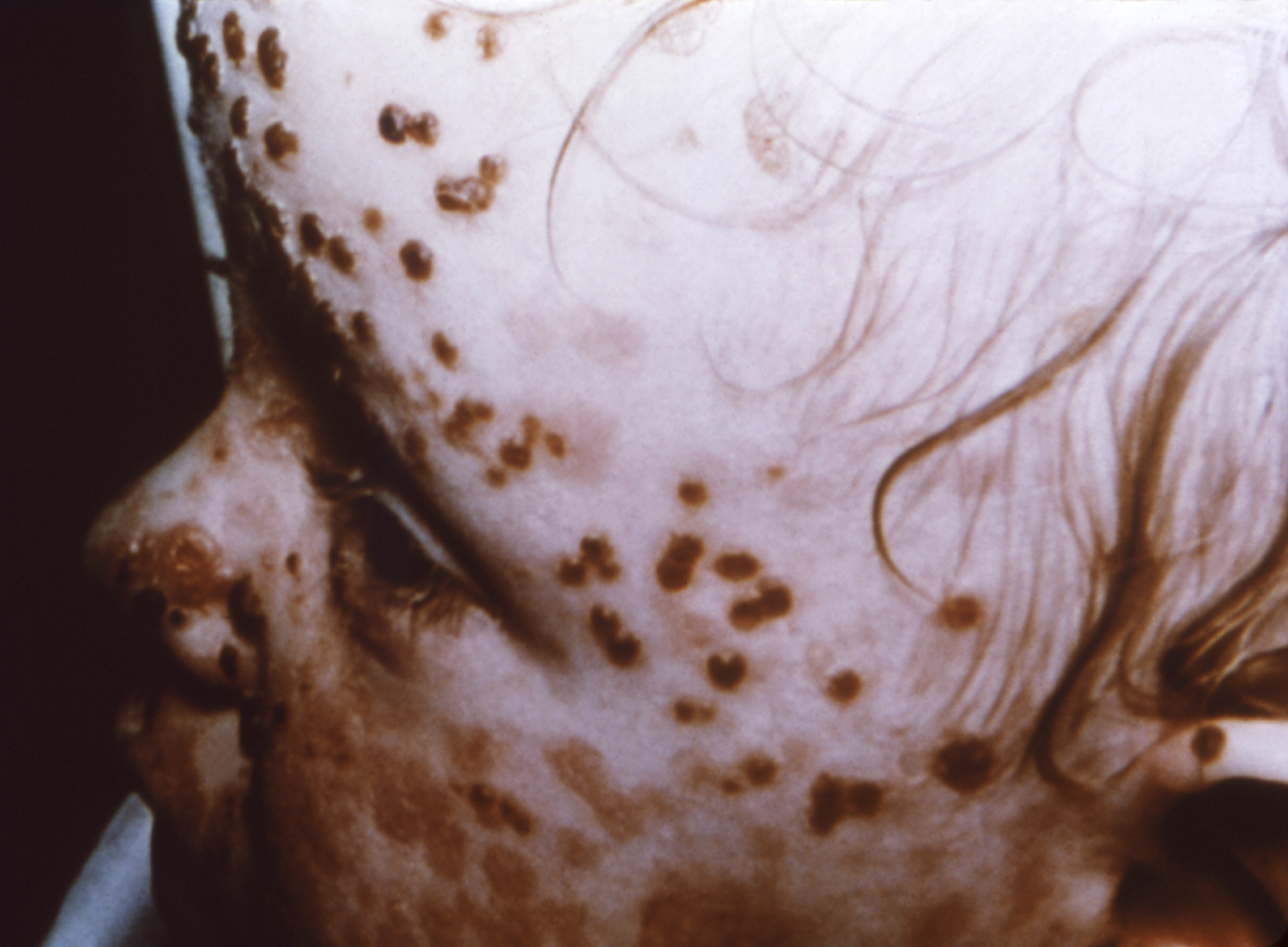 - 악성 유형: 발진이 수포가 되지 않고 붉은 반점으로 남아 있는 형태이다. 역사적으로 전체 천연두 감염 사례의 5 ~ 10%이며, 그 감염자의 절대다수(72%)는 아동이었다.[283] 거의 모든 경우 사망에 이를 정도로 치명적이다.[283]