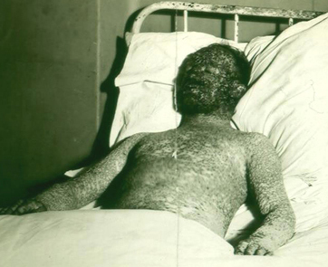 - 출혈 유형: 피부, 점막, 소화관에 광범한 내출혈을 동반하는 심각한 유형이다. 전체 천연두 감염 사례의 약 2% 정도였으며, 대부분 성인에게 발병했다.[283] 피부 아래로 출혈이 일어나 마치 새까맣게 탄 것처럼 검은색을 띤다고 하여 검은마마(black pox)라고도 불렸다.[340]