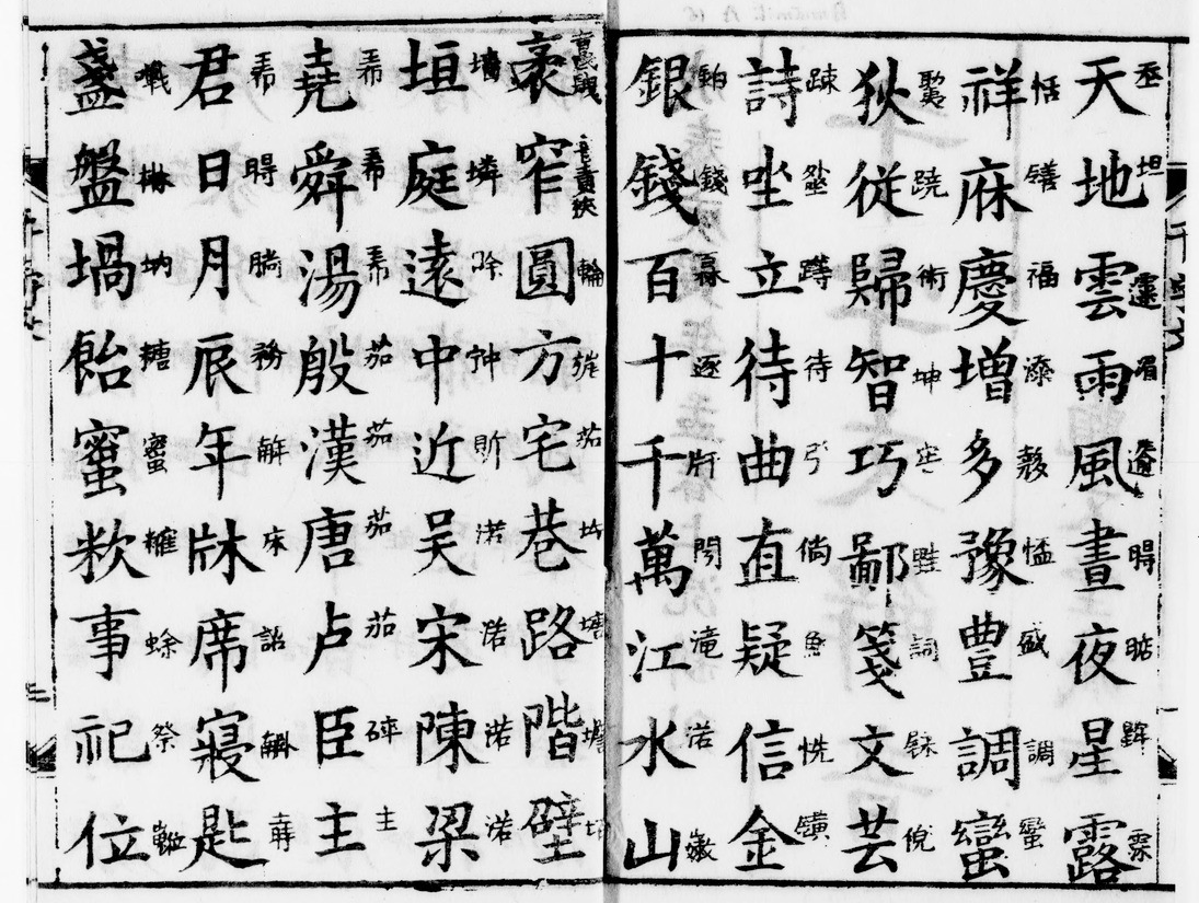 강희제 치세에 출판된 Chen Qiliang(陳啓亮)의 ''만한천자문''(滿漢千字文)은 중국어 텍스트와 만주어 음성 표기를 담고 있다.[8]