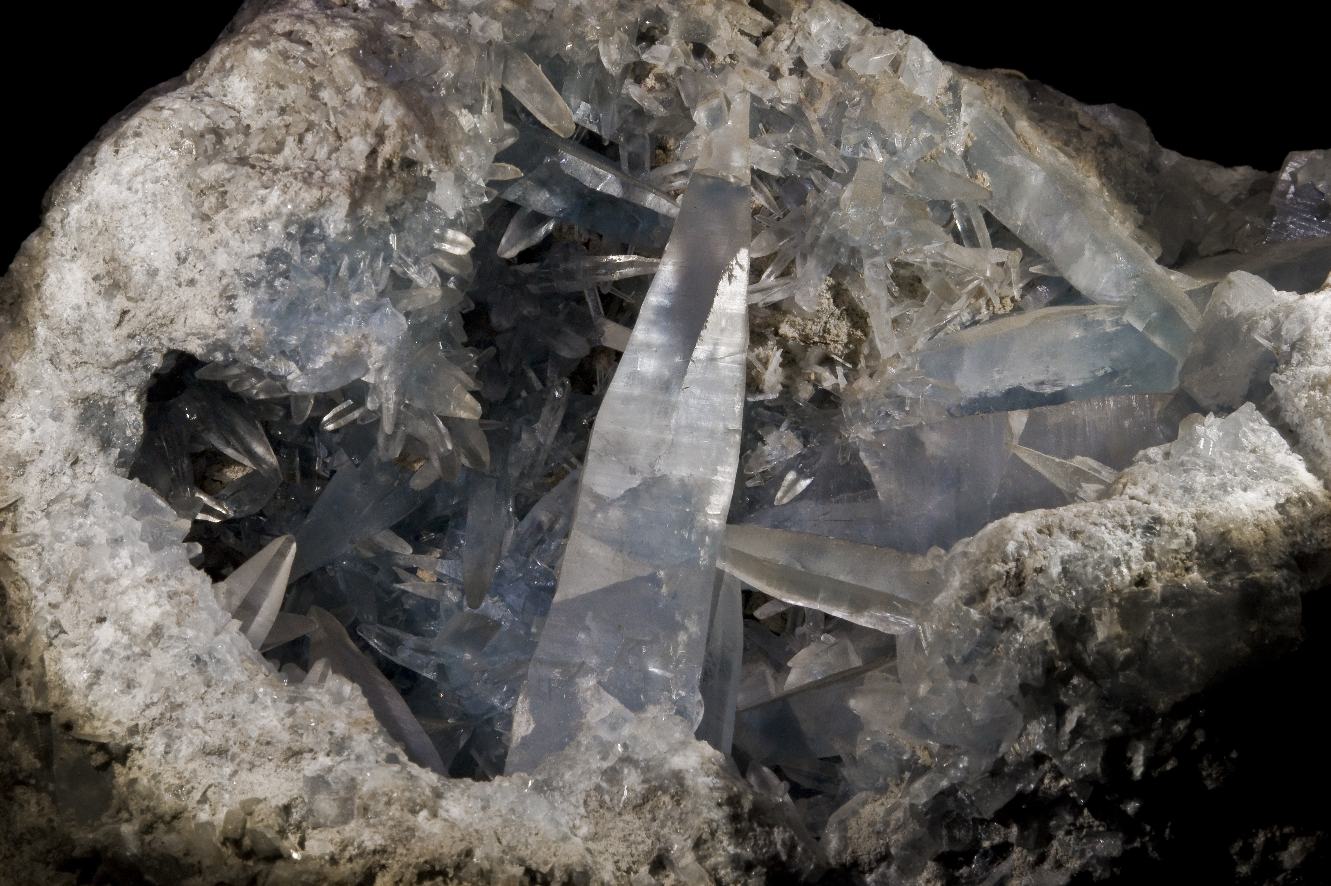 천청석 결정은 일부 정동에서 발견된다. 세계에서 가장 큰 것으로 알려진 정동은 천청석 정동으로, 지름이 10.7m에 달하며, 오하이오주 사우스 배스 섬의 이리호에 있는 푸틴베이 마을 근처에 위치해 있다. 이 정동은 관람 동굴인 크리스탈 동굴로 개조되었으며, 정동의 바닥을 이루었던 결정들은 제거되었다. 이 정동은 가로 46cm 크기의 천청석 결정을 가지고 있으며, 각 결정의 무게는 최대 140kg으로 추정된다.[13][14][15]