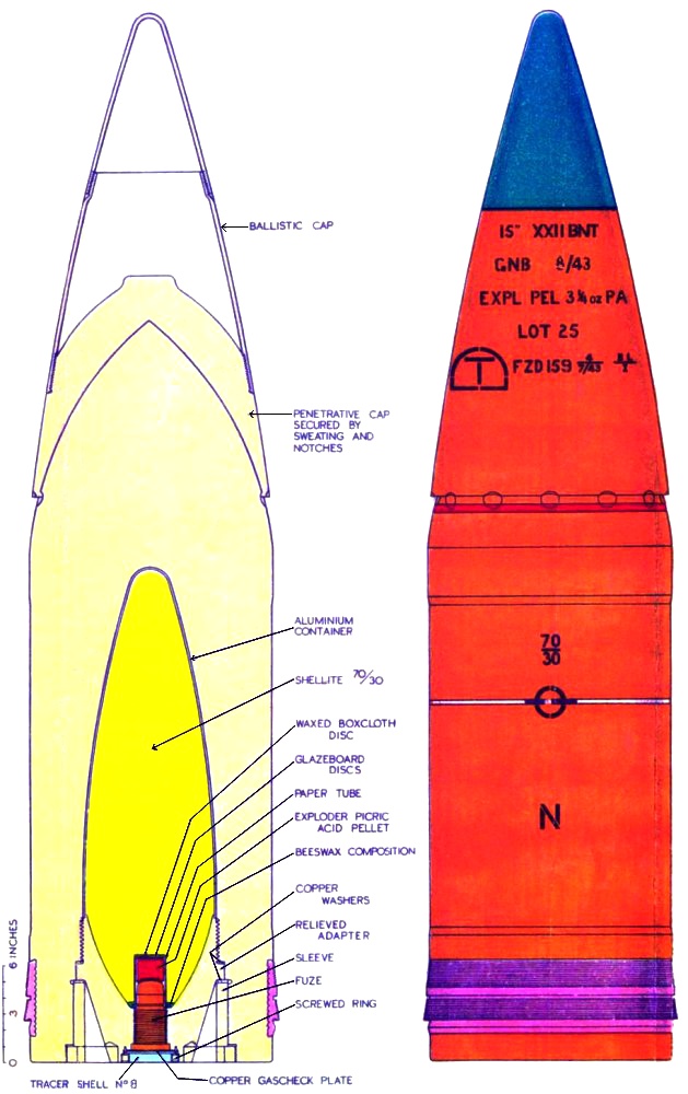 탄두 | 탄도 캡 또는 장갑 관통 캡 강철 합금 운동 에너지 관통자 둔감화된 고성능 폭약 폭발 장약 (내부 표적에서 폭발하도록 지연 설정된) 기반 신관 접합부 (전면) 및 구동 밴드 (후면) |