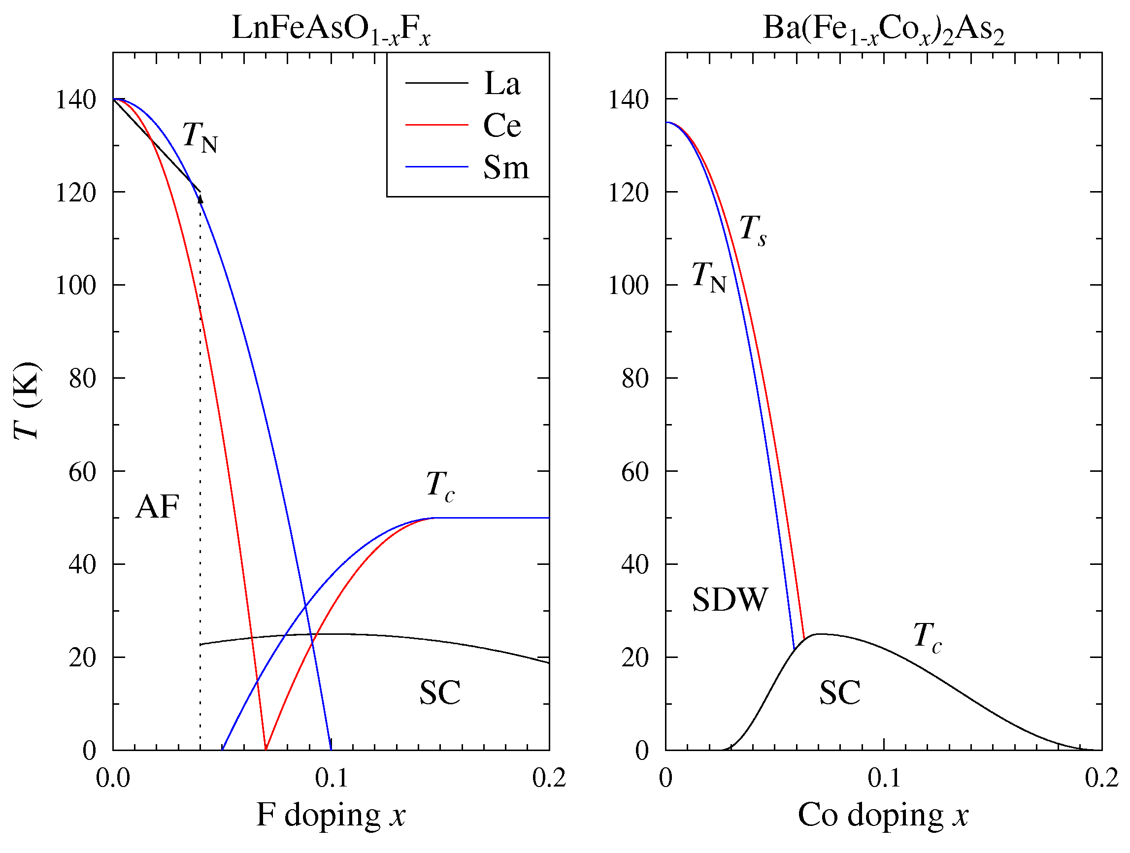 구리산화물 초전도체와 마찬가지로, 철 기반 초전도체의 특성은 도핑에 따라 극적으로 변화한다. 철 기반 초전도체의 모 화합물은 (구리산화물과는 달리) 일반적으로 금속이지만, 구리산화물과 유사하게, 종종 스핀 밀도파(SDW)라고 불리는 반강자성을 띤다.[42] 초전도(SC)는 홀 또는 전자 도핑에 의해 나타나며, 일반적으로 상 diagram은 구리산화물과 유사하다.[42]전이 온도와 전자 밴드 구조 사이에는 경험적 상관 관계가 있다. Tc 최대값은 일부 페르미 표면이 리프시츠 위상 전이에 근접해 있을 때 관찰된다.[42] 유사한 상관 관계가 고온 Tc 구리 산화물에 대해 나중에 보고되었으며, 이는 이 두 고온 초전도체 계열의 초전도 메커니즘의 유사성을 시사한다.[52]