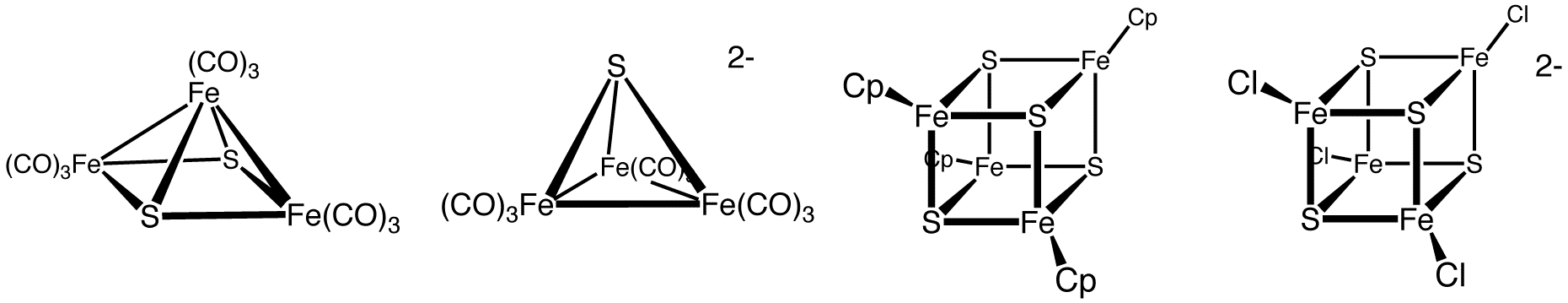 실험실에서 다양한 [Fe₄S₄(SR)₄]²⁻ 및 [Fe₃S₄(SR)₃]³⁻ (불완전한 큐베인) 클러스터가 합성되었다.[17]