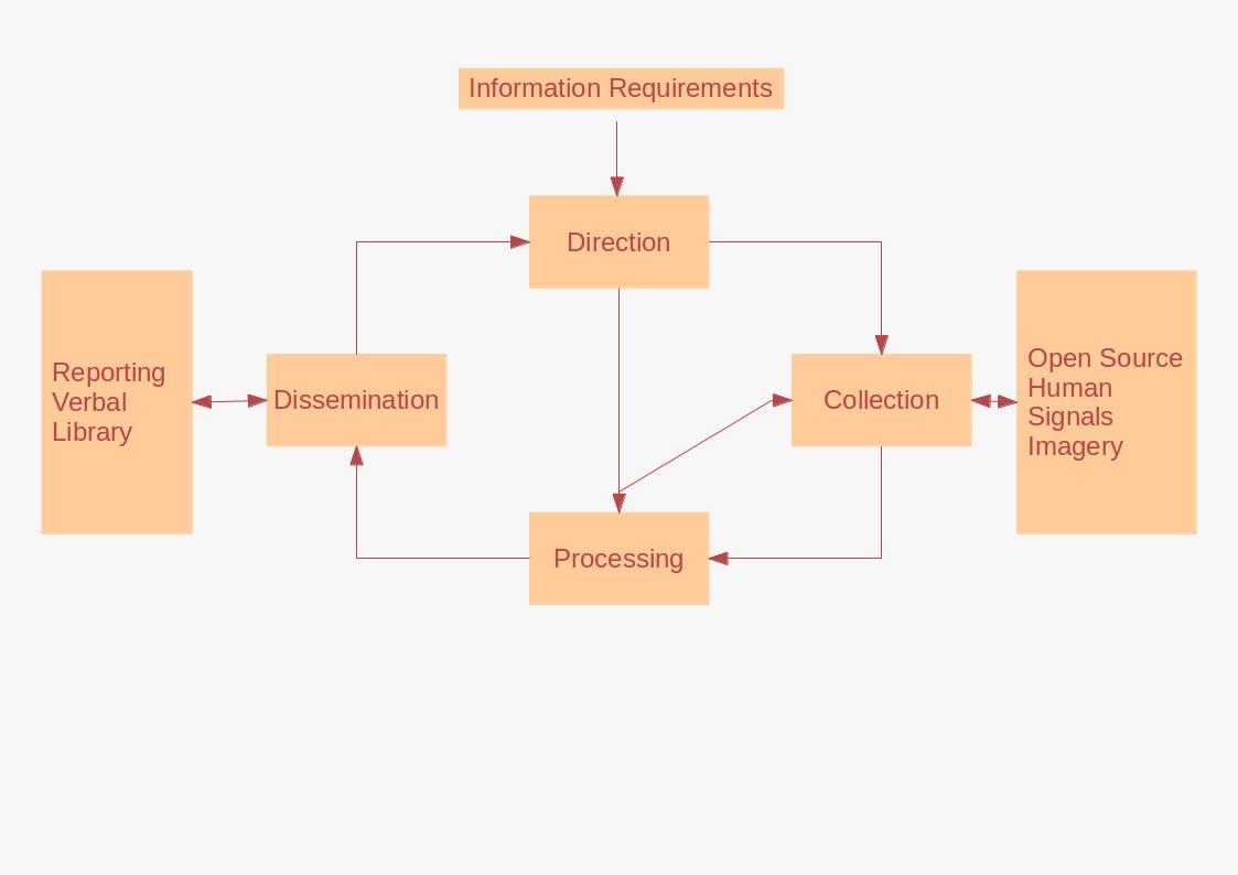 새로운 정보는 다양한 수집 분야 중 하나 이상을 통해 '''수집'''될 수 있다. 인적 정보원, 전자 및 통신 감청, 영상 정보 또는 개방형 정보원. RFI의 성격과 부여된 긴급성에 따라 수집 또는 검증에 소요되는 시간으로 인해 일부 수집 유형이 부적합할 수 있다. 정보 수집 분야 및 사용된 출처와 방법은 종종 매우 기밀이며 구획화되어 있으며, 분석가는 적절한 높은 수준의 보안 등급이 필요하다.