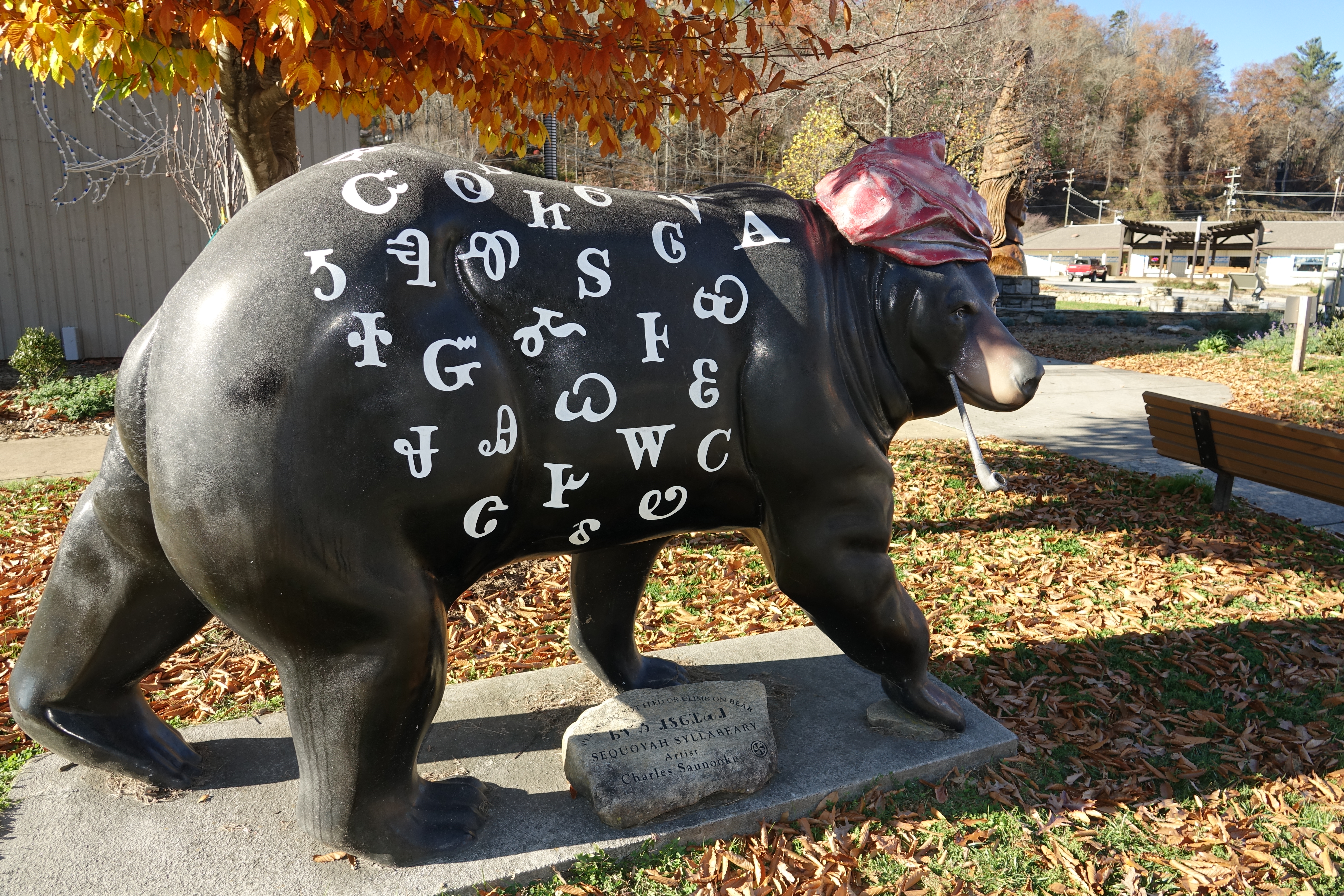 세쿼야 문자를 새긴 찰스 사누크의 곰 조각상. 노스캐롤라이나 주 체로키에 있는 체로키 민족 박물관(Museum of the Cherokee People) 외부, 2017년 촬영