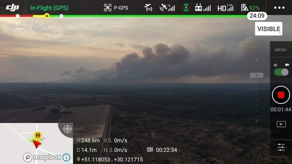 3월 27일, 당시 우크라이나 의회 인권 담당관인 류드밀라 데니소바는 10,000헥타르에 걸쳐 31건의 화재가 발생했다고 말했다.[25] 데니소바는 이러한 화재가 "...방사성 대기 오염 수준을 증가시켰다"고 언급했다. 소방관들은 이 지역에 주둔한 러시아군 때문에 화재 현장에 접근할 수 없었다. 이러한 산불은 계절적인 현상으로, 2020년에 11,500 헥타르 규모의 화재가 발생했고, 2010년대에도 여러 차례 작은 화재가 발생했다.