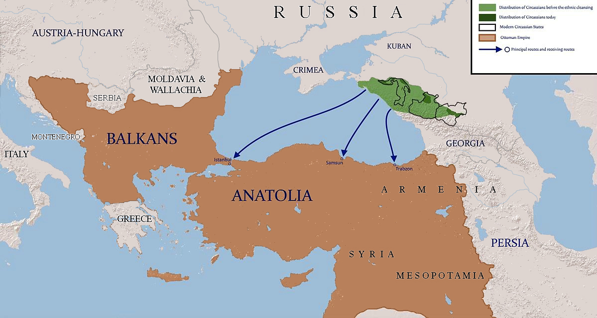 19세기 말 러시아 제국의 침공으로 러시아-체르케스 전쟁이 발발하여 체르케스는 제국의 영토로 흡수되었다. 이 과정에서 지역 인구 대다수는 고향에서 인접국 오스만 제국으로 추방당했다.[190]