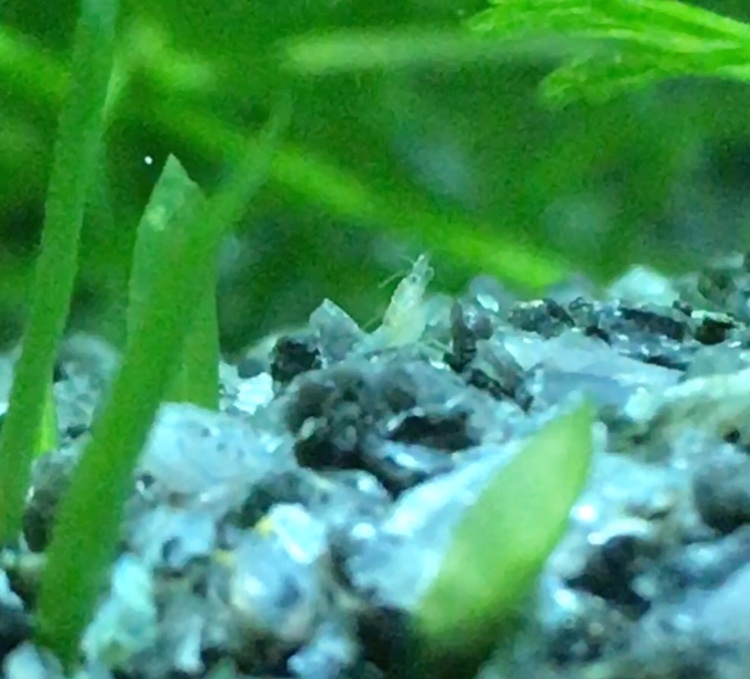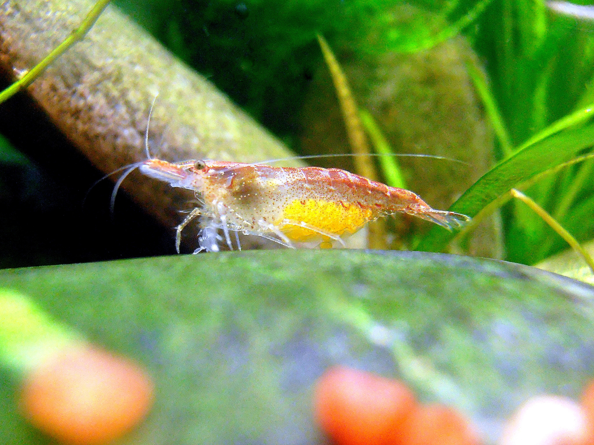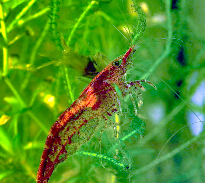 생후 이틀 된 ''Neocaridina davidi'' (레드 모프) 새우 (길이 약 1mm)