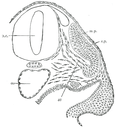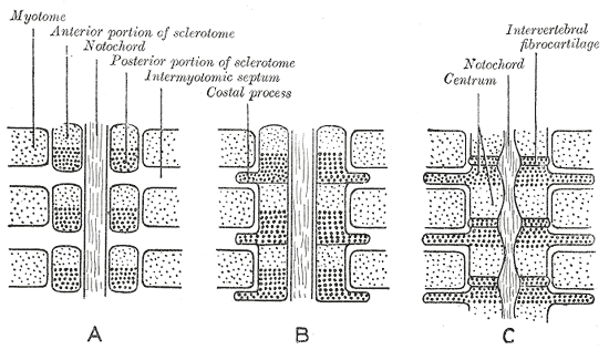 '''뼈분절'''은 척추뼈, 갈비연골, 그리고 뒤통수뼈의 일부를 이룬다. 뼈분절 세포들은 척삭을 향해 안쪽으로 이동하다가, 반대쪽에서 온 뼈분절 세포들과 만나 척추뼈몸통을 이룬다. 각 척추뼈몸통은 뼈분절 하나의 꼬리쪽 절반이 이웃한 뼈분절의 머리쪽 절반과 융합하여 만들어진다.[11] 뼈분절 세포들은 여기에서부터 다시 등쪽으로 이동해서 발생 중인 척수를 둘러싸 척추뼈고리를 만든다. 등뼈 부근에서는 일부 세포들이 멀리 뻗어나가 갈비뼈를 만든다.[11]2. 2. 4. 힘줄분절