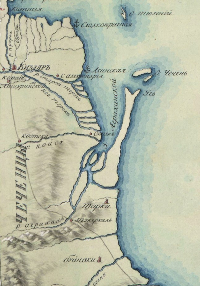 체첸섬은 1500년경 이탈리아 지도에 '시카마텔라'(sicamatela)라는 이름으로 처음 등장한다. 이 섬은 체첸인의 이름을 따서 명명되었다. 러시아 지리학자이자 군인에 따르면, 체첸인은 이전에 바다까지 정착했었다고 한다.[4] 독일 탐험가 사무엘 고틀리프 멜린은 1774년까지 이 지역을 방문했는데, 체첸인들이 섬에서 낚시를 했다고 언급했다.[5] 사무엘 고틀리프 멜린은 "달의 열흘째 아침 7시경, 우리는 체첸 섬으로 출발했다. 이 섬은 산에 사는 민족인 체첸인들의 이름을 따서 명명되었다. 그들은 여기서 낚시를 한다."라고 기록했다.[6] 1863년에는 섬에 등대가 영국인 건축가들에 의해 건설되었다.[7]2. 2. 등대 건설과 러시아 제정 시대
