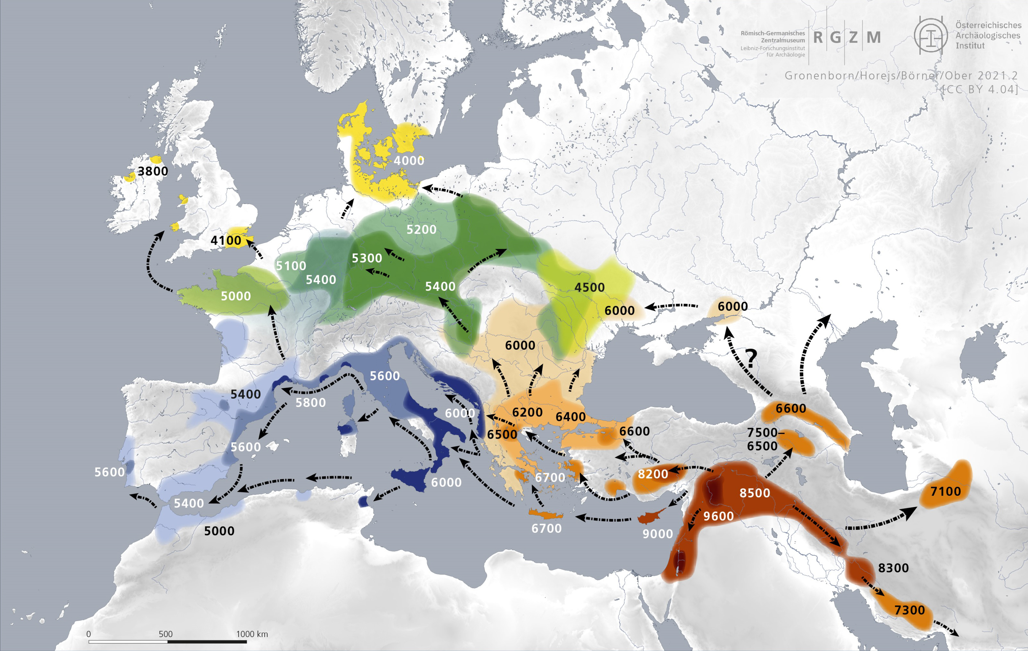 기원전 7천 년경, 아나톨리아에서 기원한 초기 유럽 농경민은 발칸 반도를 거쳐 유럽으로 농업을 전파하기 시작했다.[3] 이들은 다뉴브 강을 따라 서유럽으로 이동하거나(선형 도기 문화), 지중해 연안을 따라 서쪽으로 이동하면서(카르디알 도기) 유럽 각지에 농경 문화를 확산시켰다. 중석기 시대에는 일부 EEF 유래 공동체에서 서유럽 수렵 채집인(WHG) 조상이 남성을 중심으로 다시 증가하는 현상이 나타나기도 했다.