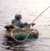 랜딩 네트를 들고 있는 플로트 튜브 낚시꾼.