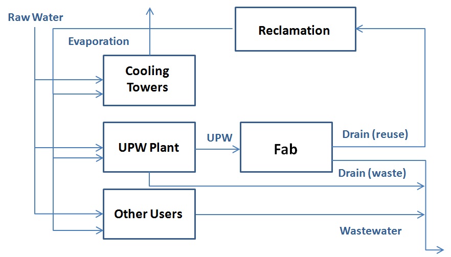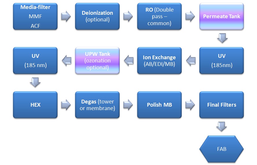 반도체 소자나 액정 패널 등을 생산하는 대규모 공장에서는 초순수를 안정적으로 대량 공급하기 위해 여러 단위 장치를 조합한 플랜트 설비를 운영한다. 초순수 제조 기술은 대규모 화력 발전소 및 원자력 산업의 수요에 맞춰 발전해 왔으며, 특히 반도체 산업에서는 회로 패턴의 미세화에 따라 요구되는 초순수의 품질 수준이 지속적으로 높아지고 있다.[47]일반적인 초순수 제조 플랜트의 공정은 다음과 같다.